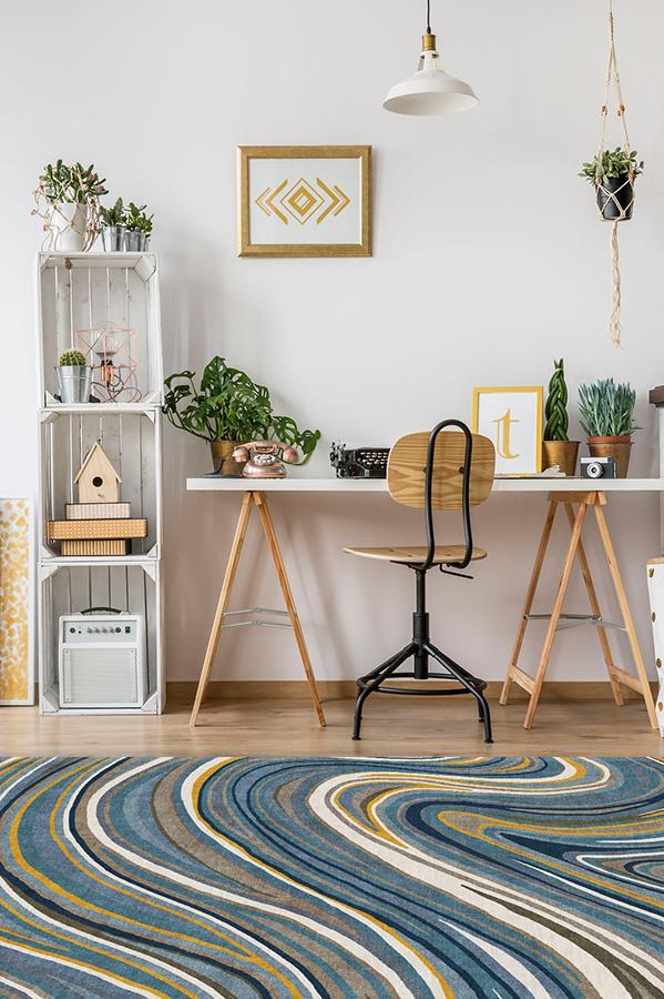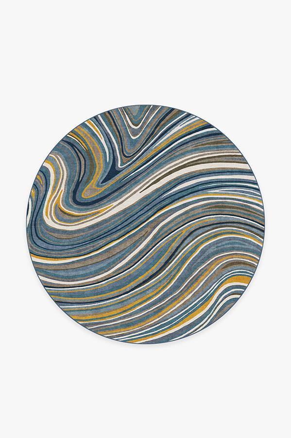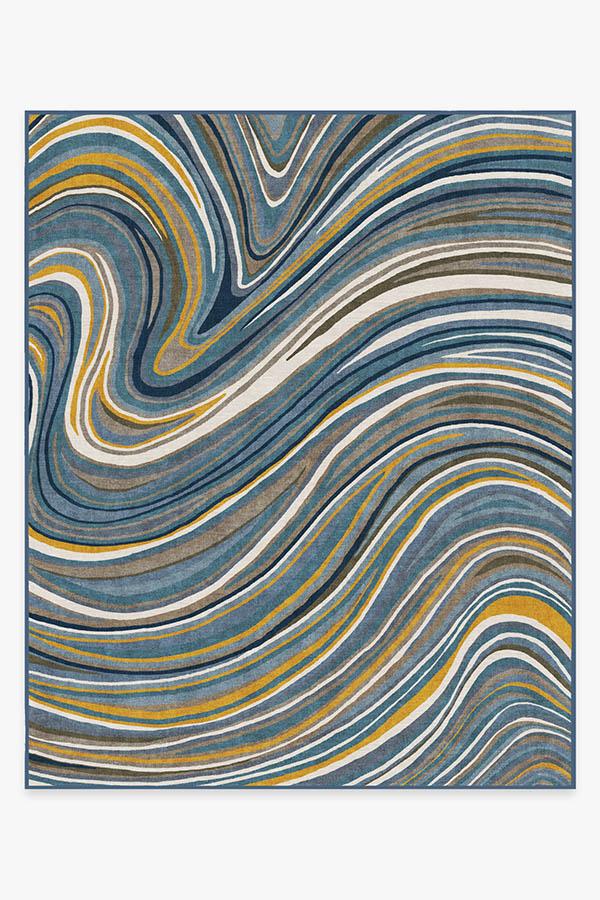 Inspired by the gemstone known to promote harmony and balance, our Agate Golden Azure rug will beautifully complement your current home furnishings. The exquisite motif of wavelike curves is displayed in a myriad of oceanic colors including slate blue, Nordic blue, Danish yellow, oyster and eggshell. A perfect design decision to anchor and add energy to any modern, contemporary or coastal style room.