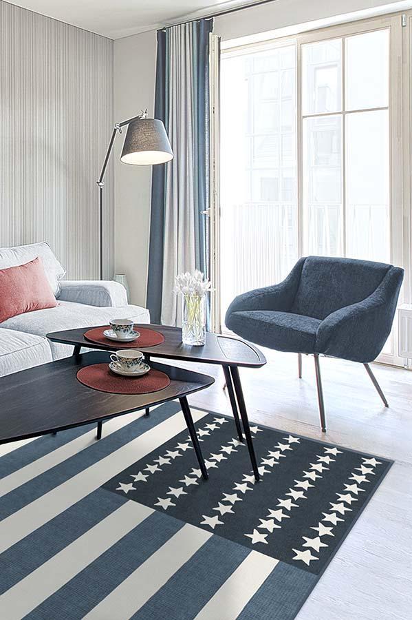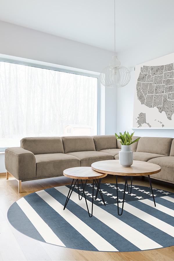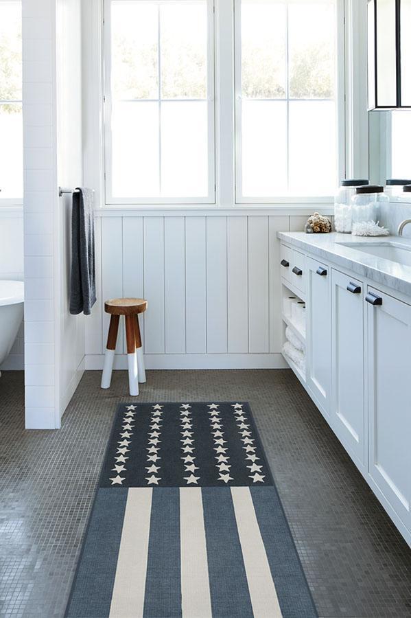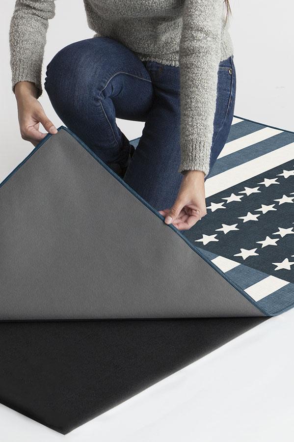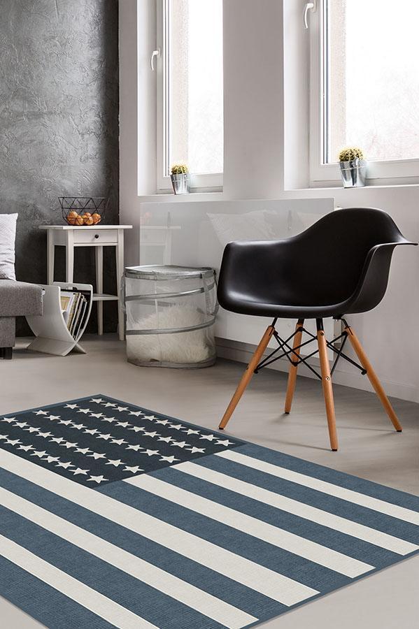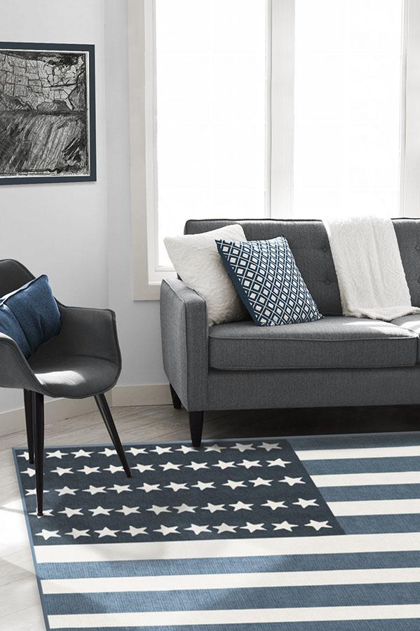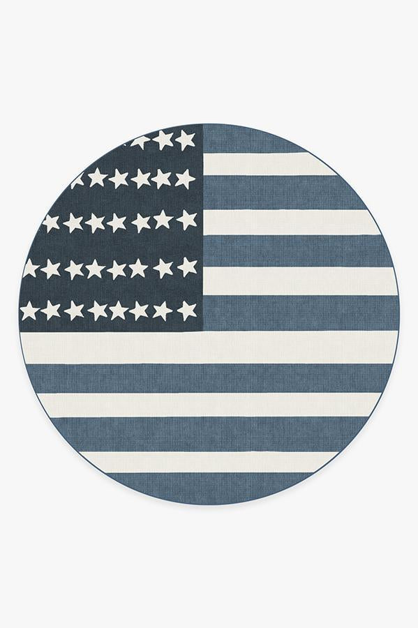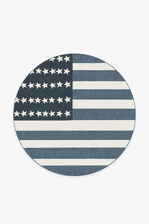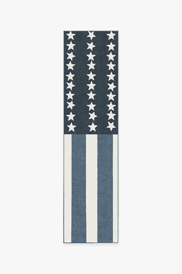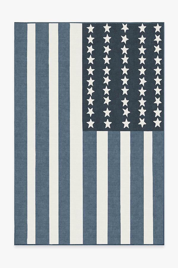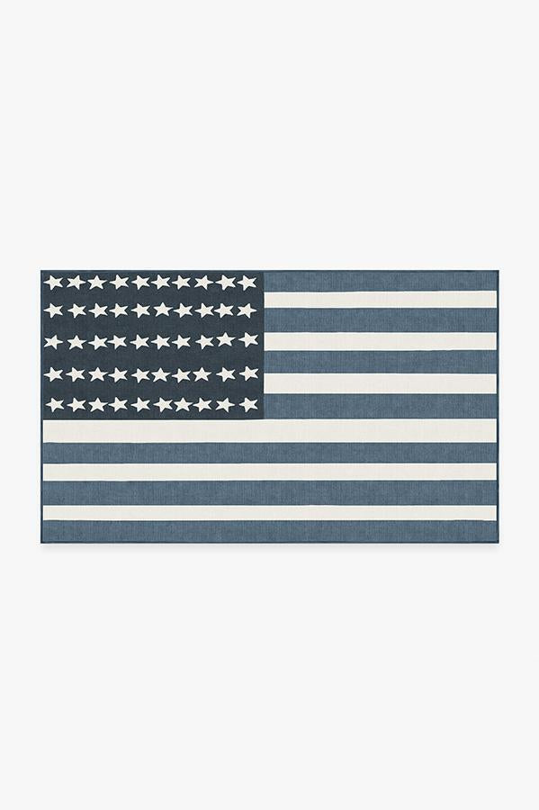 Our American Flag Blue Rug takes an edgy twist on Old Glory. This stars-and-stripes motif is washed in muted tones of slate blue and pearl, giving this iconic symbol a more contemporary feel.
