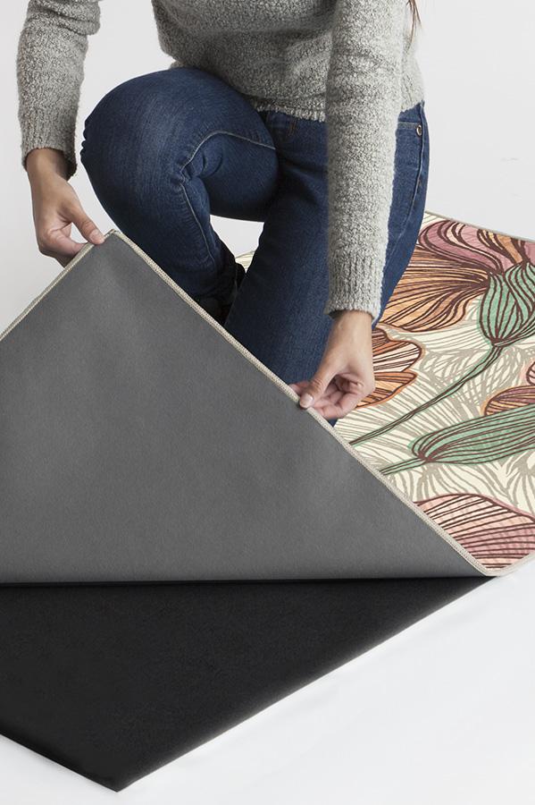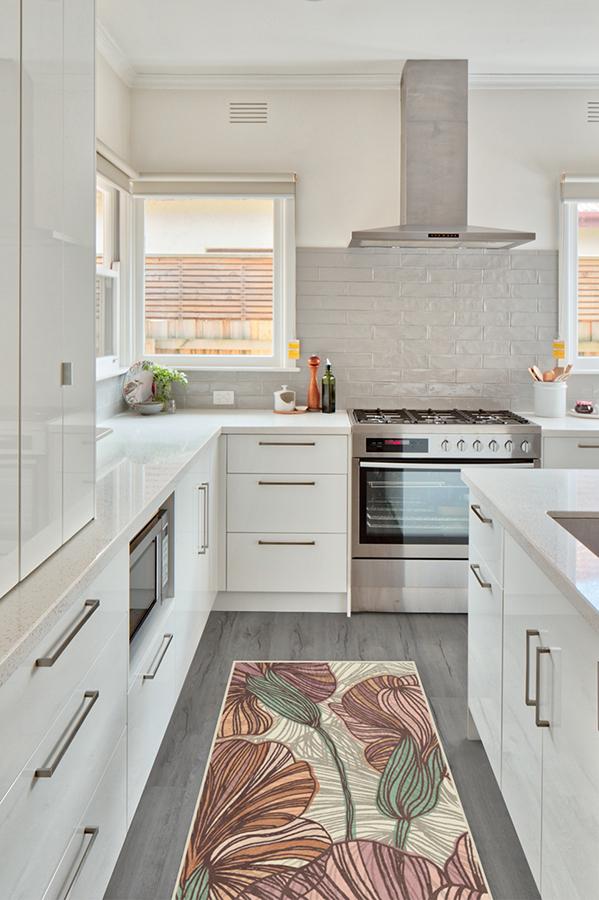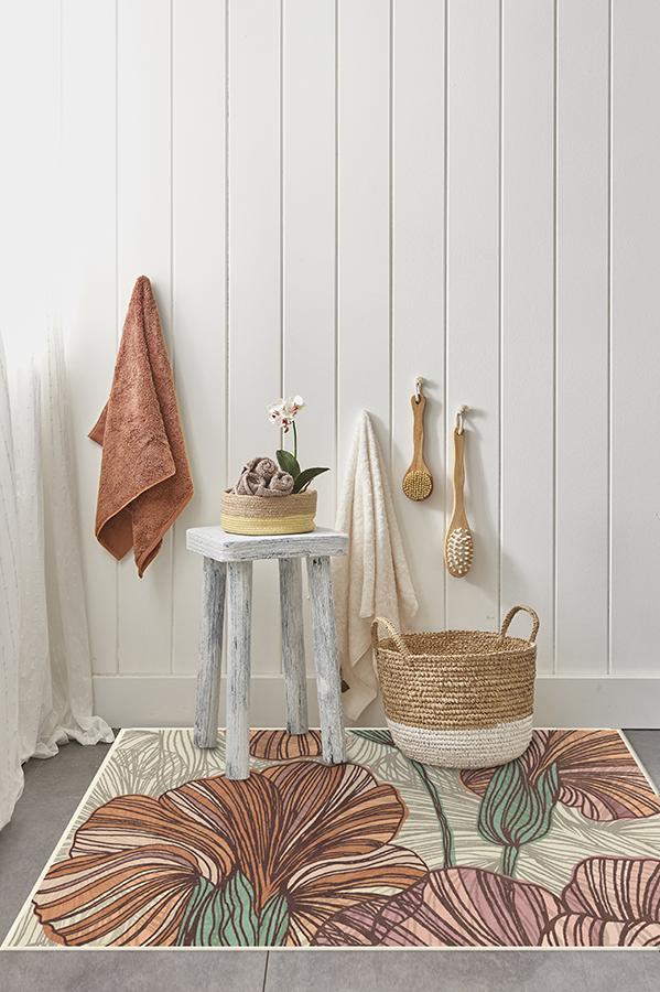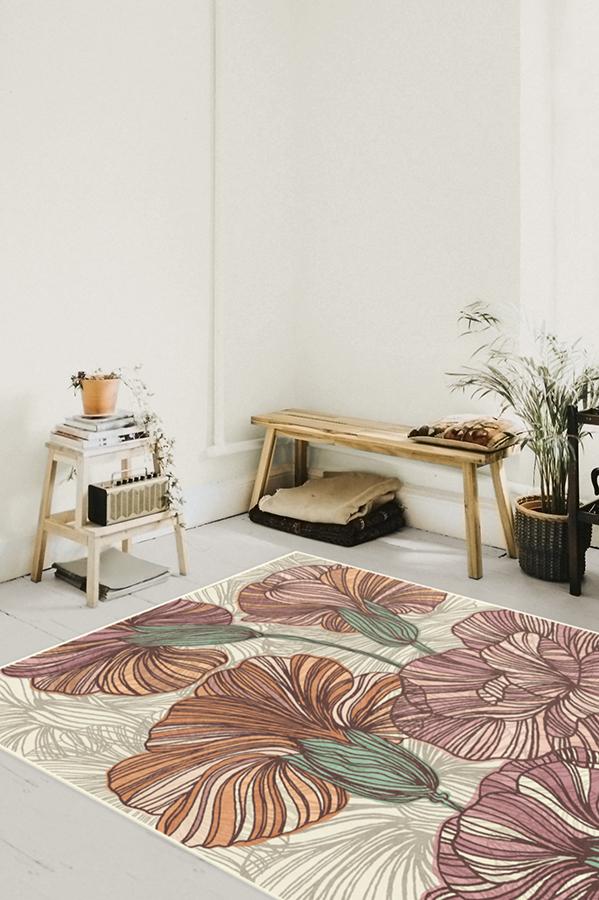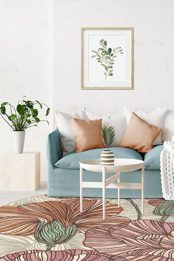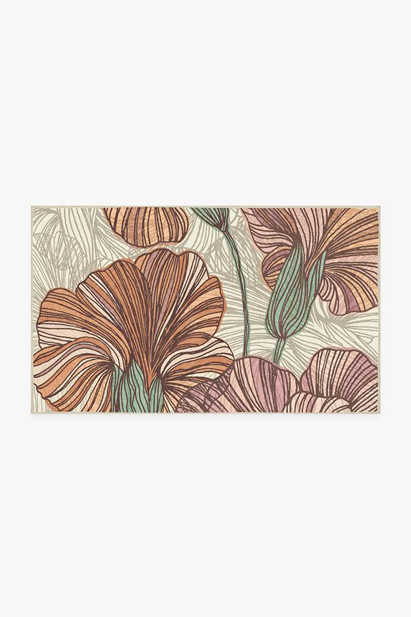 Our vintage-style Carnation Blush rug enjoys an elegant line work motif in lively hues of pink and orange with touches of green.