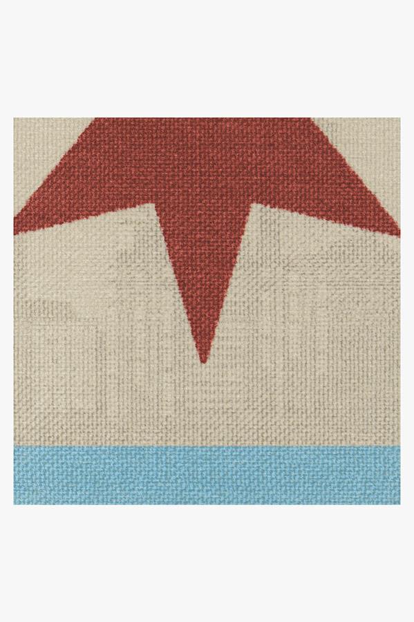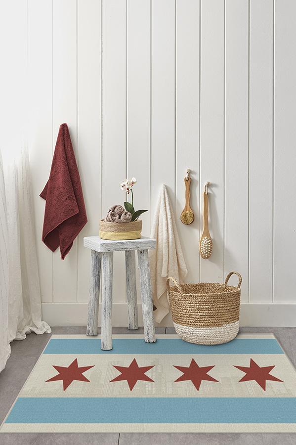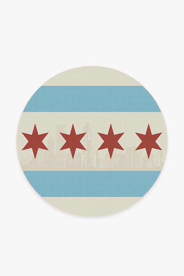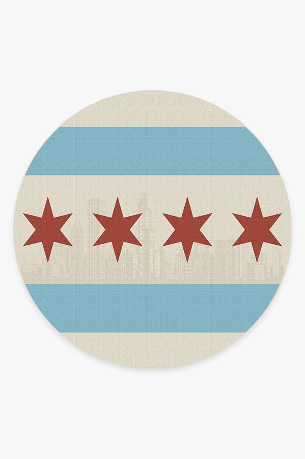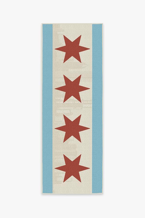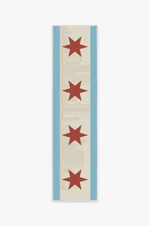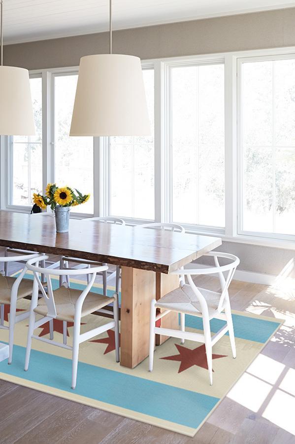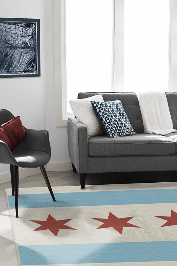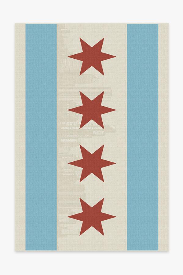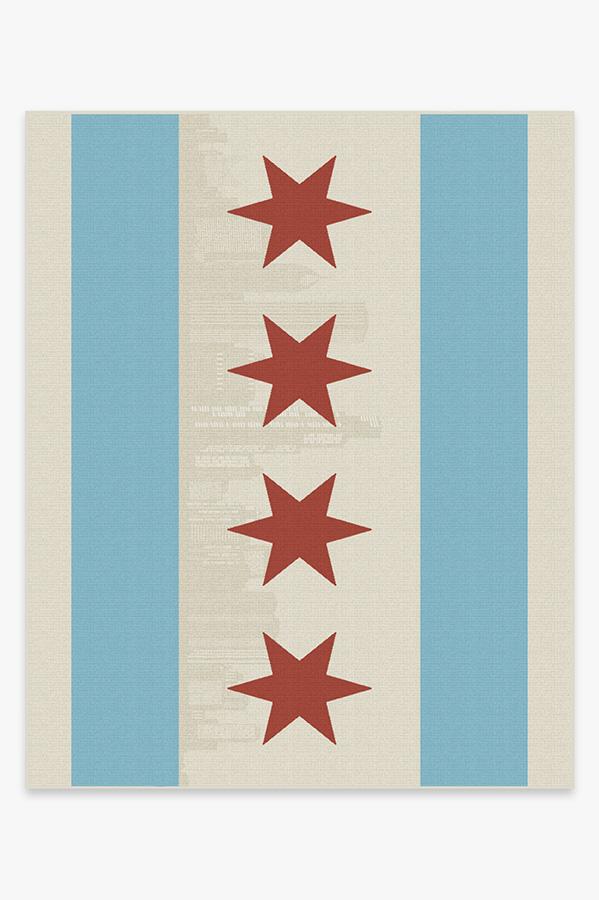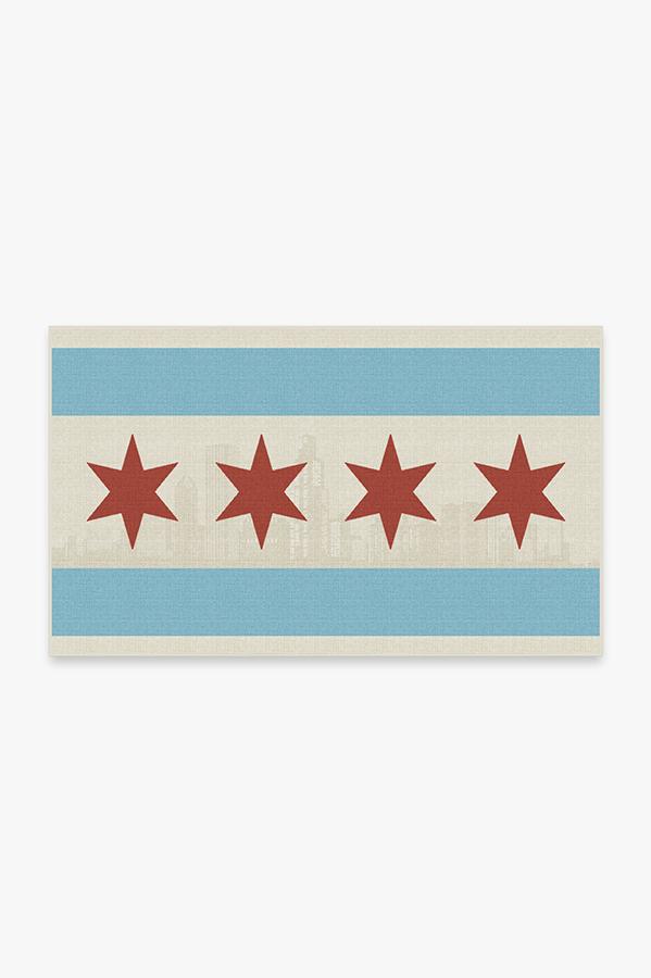 Bring the spirit of the Windy City home with our Chicago Flag Rug. This design features the flag's signature baby blue stripes with four red stars at the center, punctuated by a faint overlay of the city's iconic skyline on a pearl background.