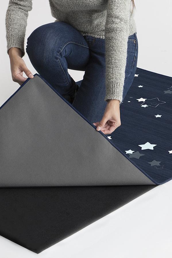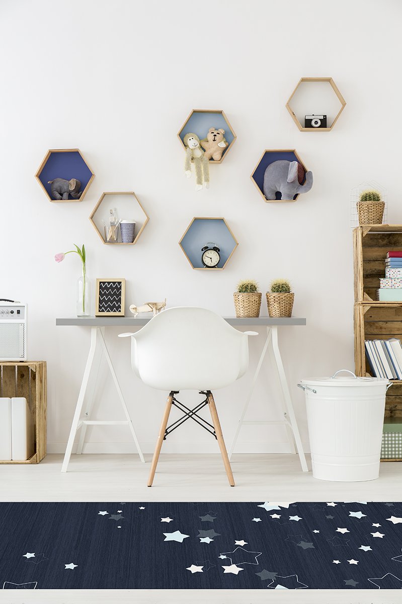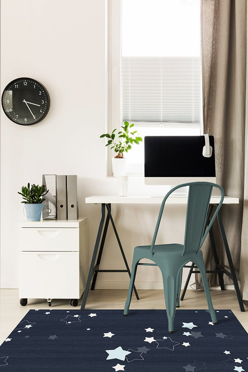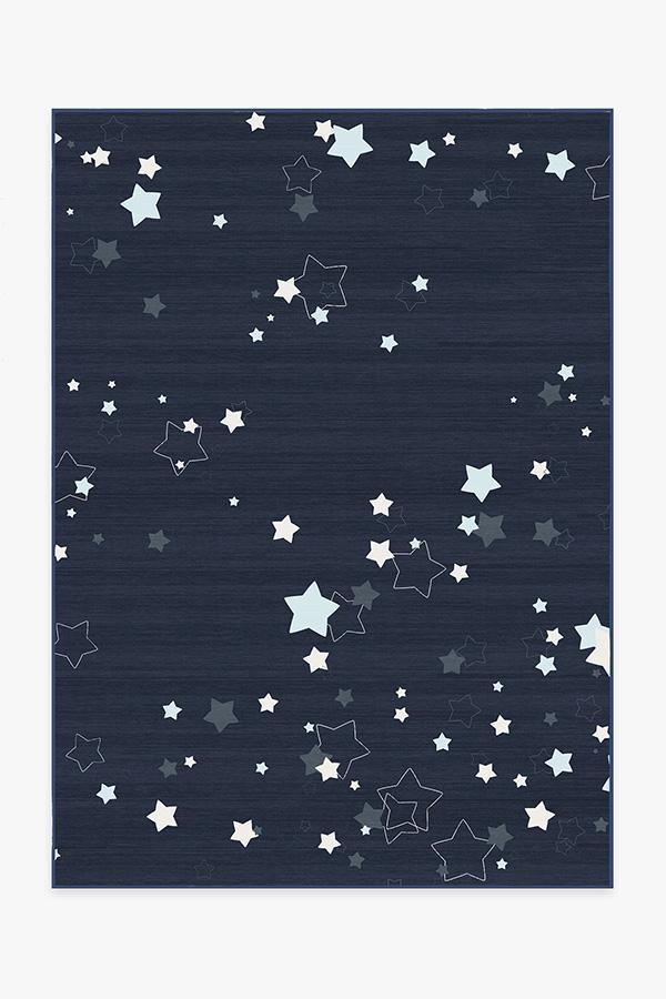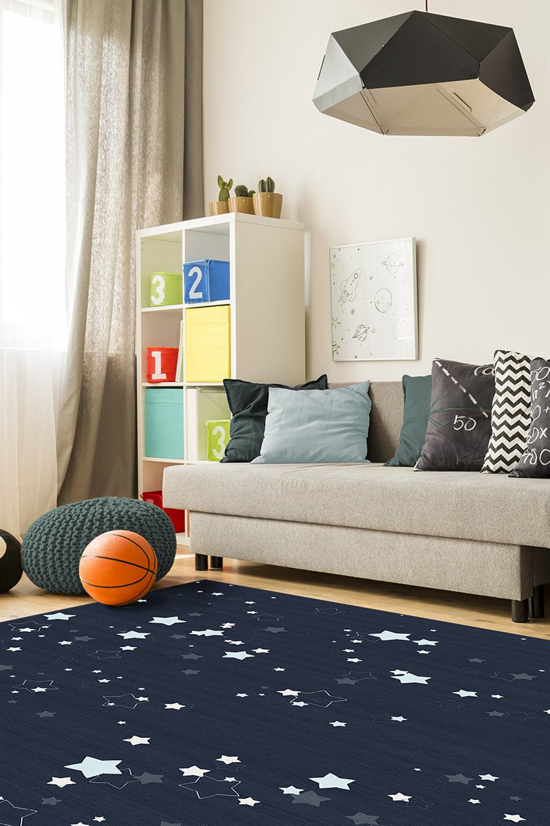 For a touch of twinkle and modern sparkle, complement your child's decor with our Constellation Navy rug. The crispness of its stellar star design and contrasting black, blue and pearl colors, give this decorative piece a sophistication for stylish, imaginative look.