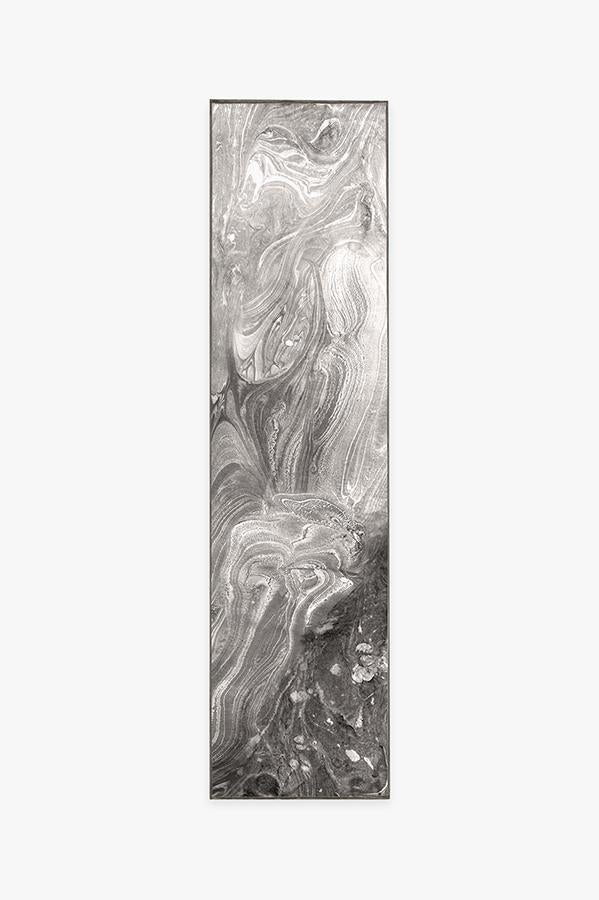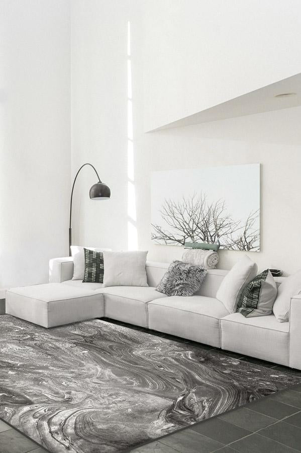 Custom designed for our Metal and Stone collection, this Cosmic Marble Grey rug features a true-to-life marbling motif that showcases swirling hues of mascarpone white and dark grey resulting in a decor piece that will no doubt become the focal point of any room.