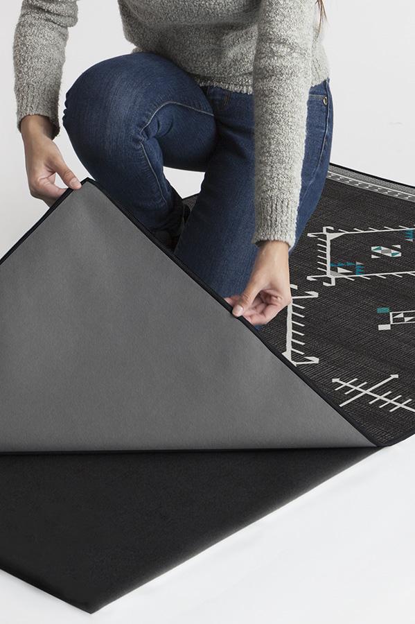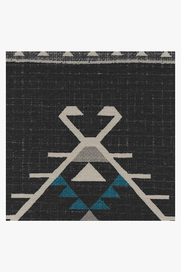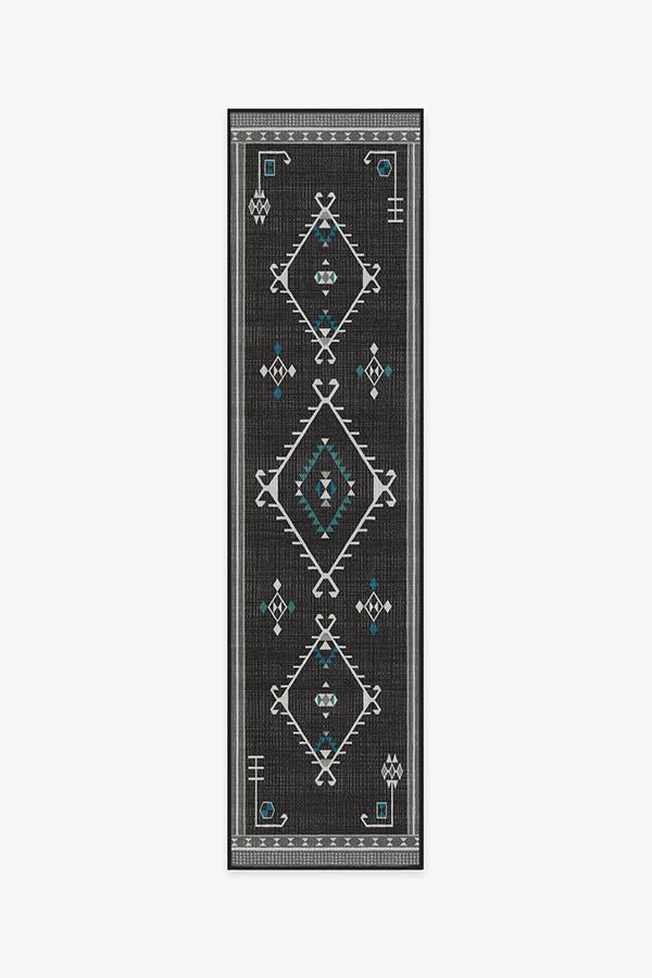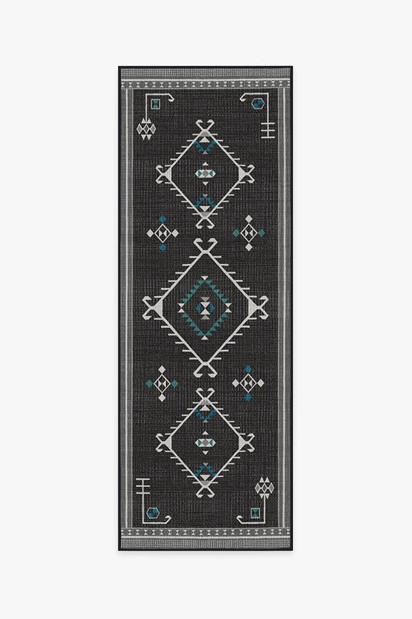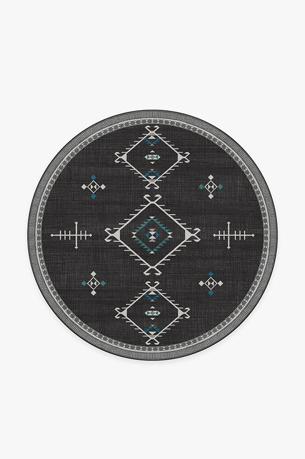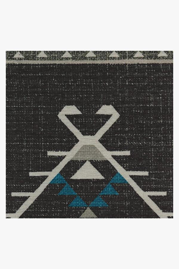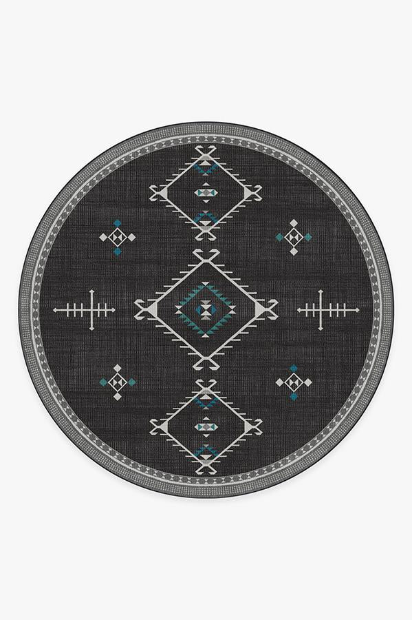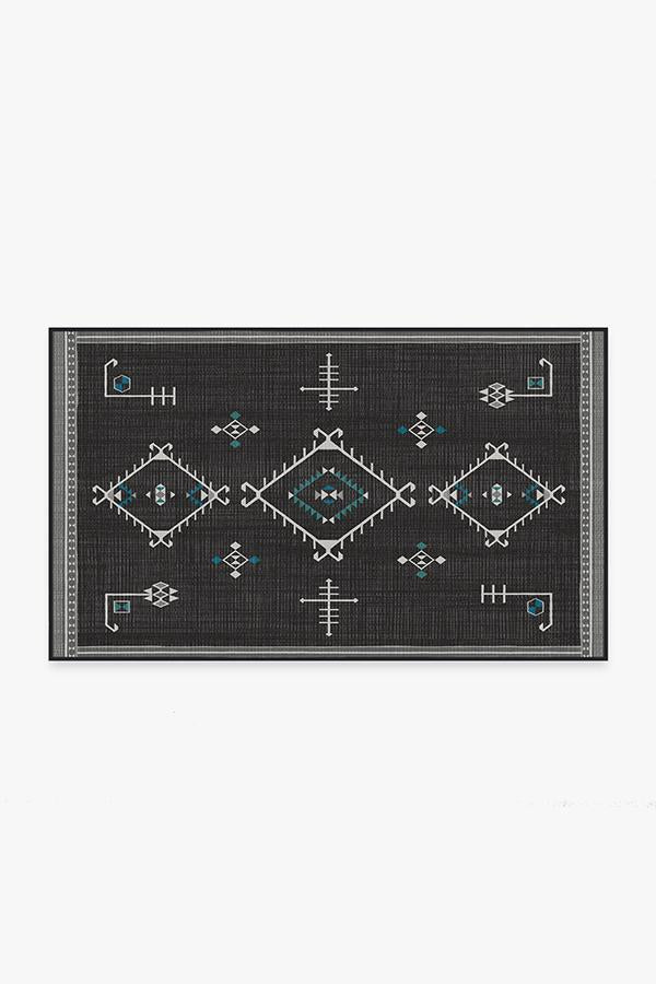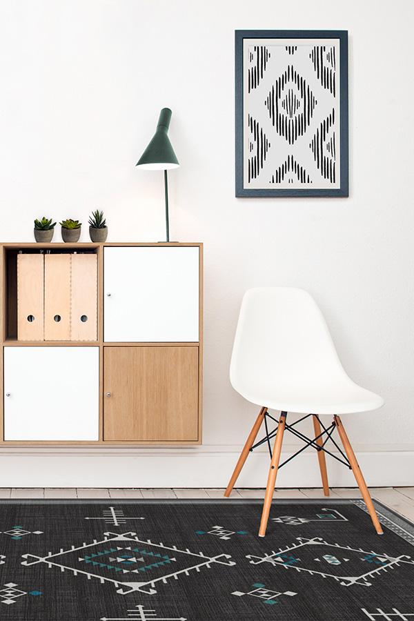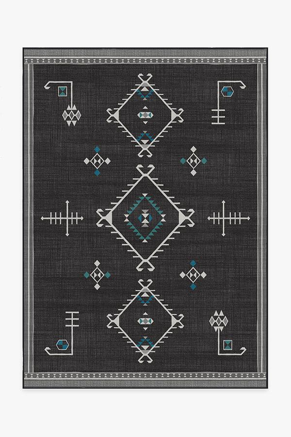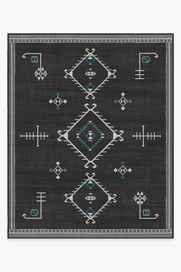 By playing with texture and a pared-down color palette, our Damali Charcoal Rug takes a fresh twist on traditional design. A trio of diamonds, tinted in white on charcoal with pops of teal blue, serve as the centerpiece of this rug, surrounded by tribal-like linework for that modern, minimalistic appeal.