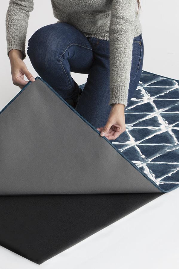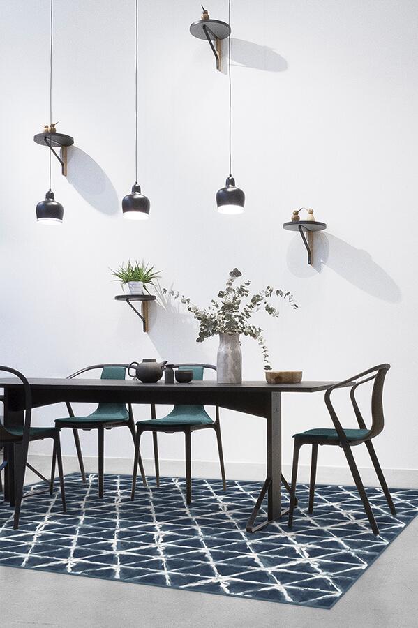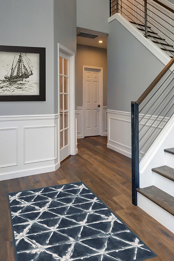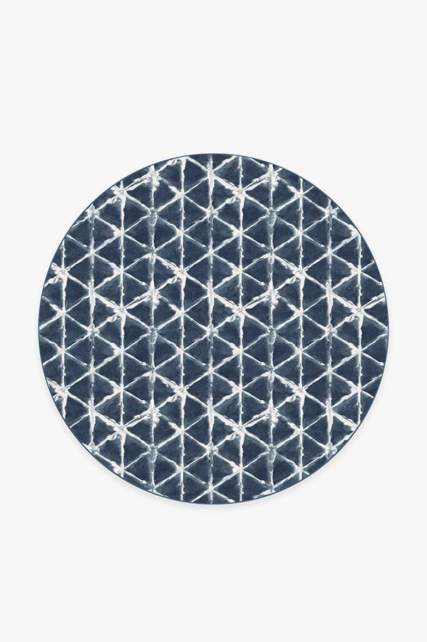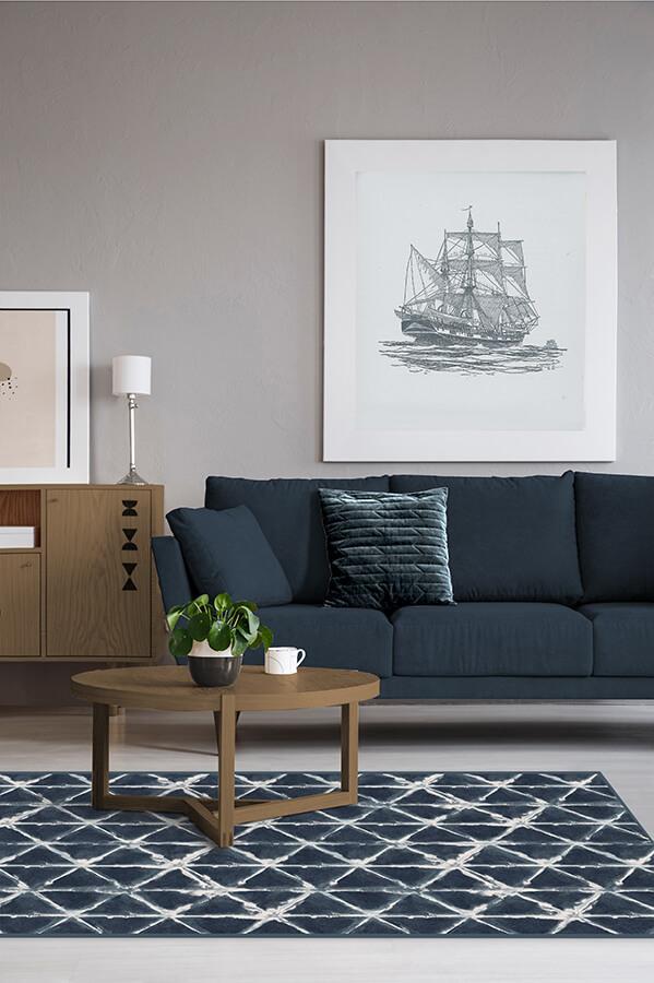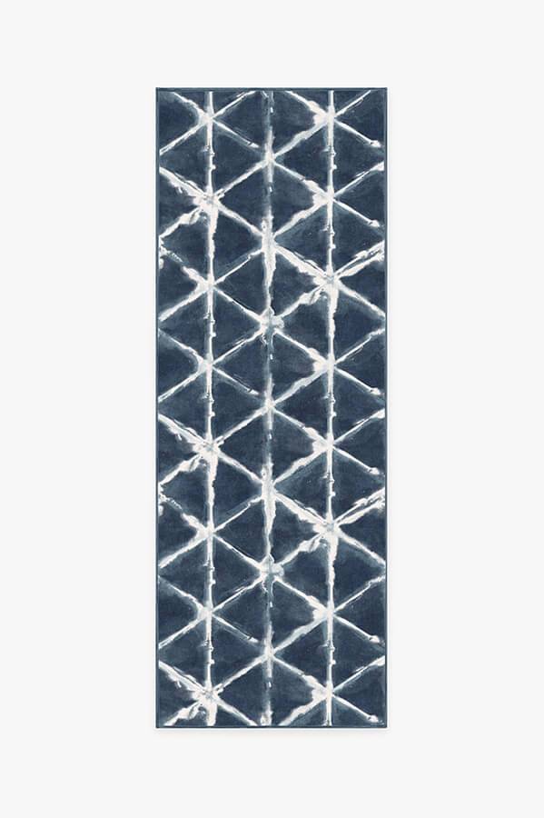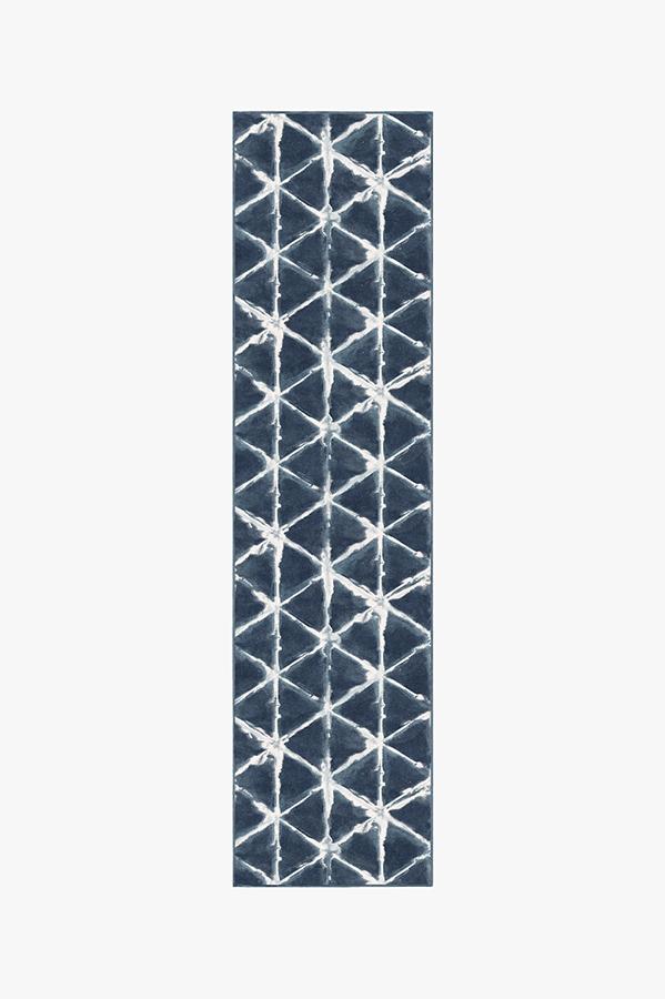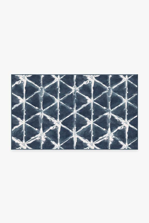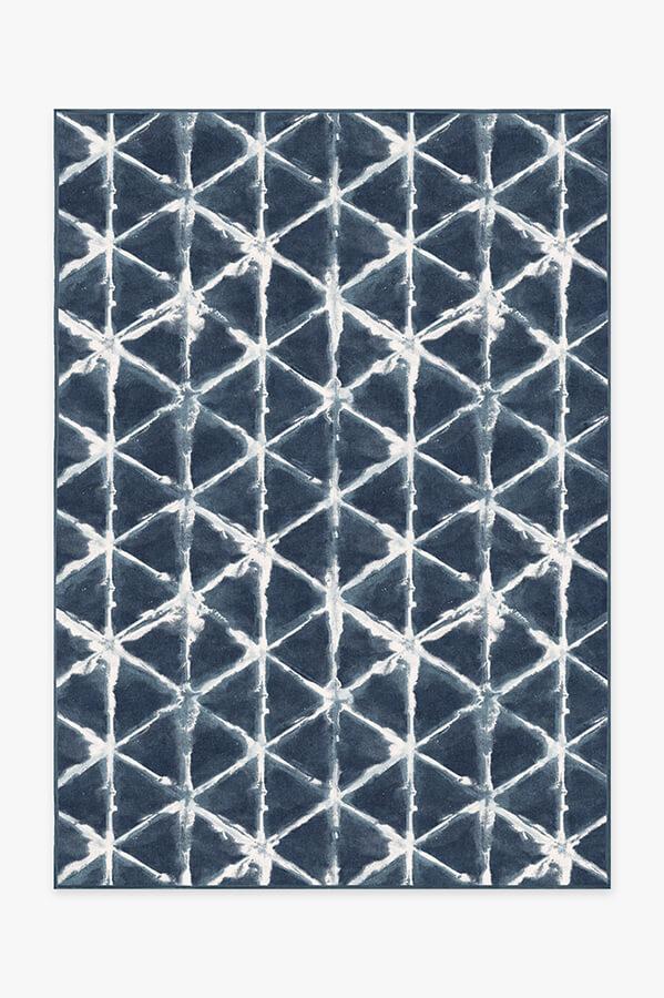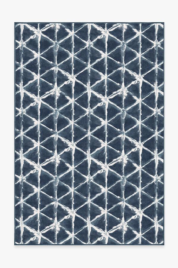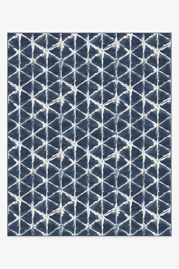 Our globally inspired Diamond Shibori Navy rug features a motif of repeating organic diamonds in rich shades of blues and white.