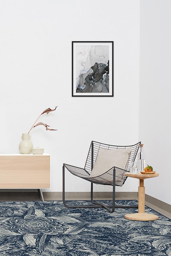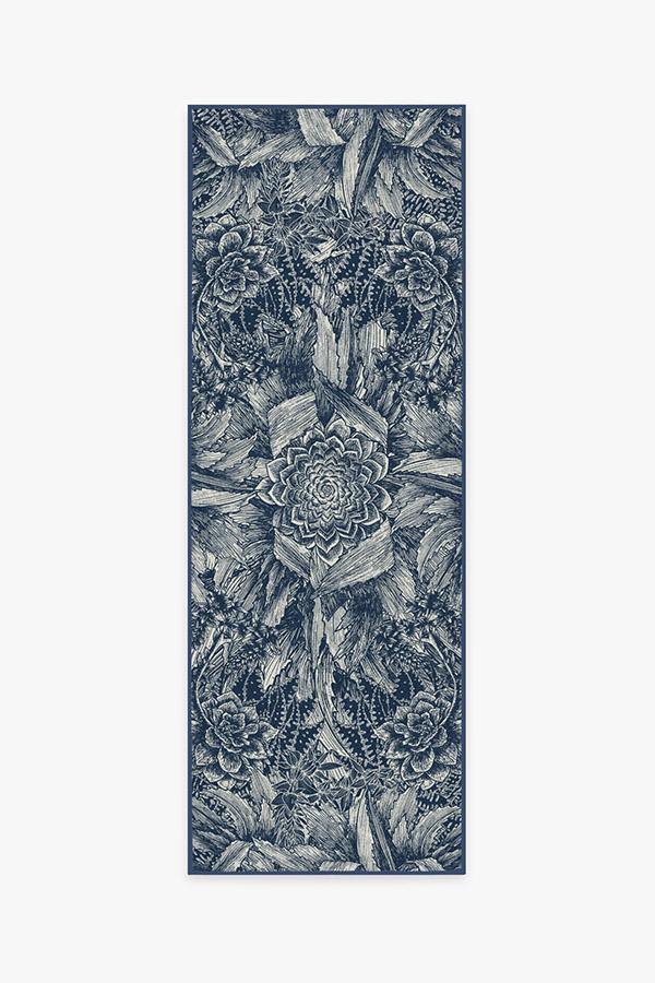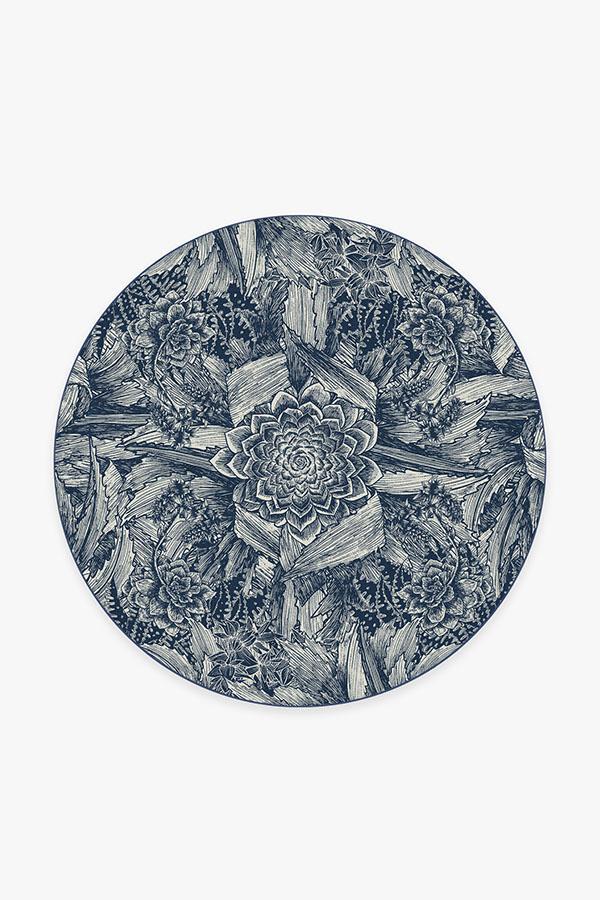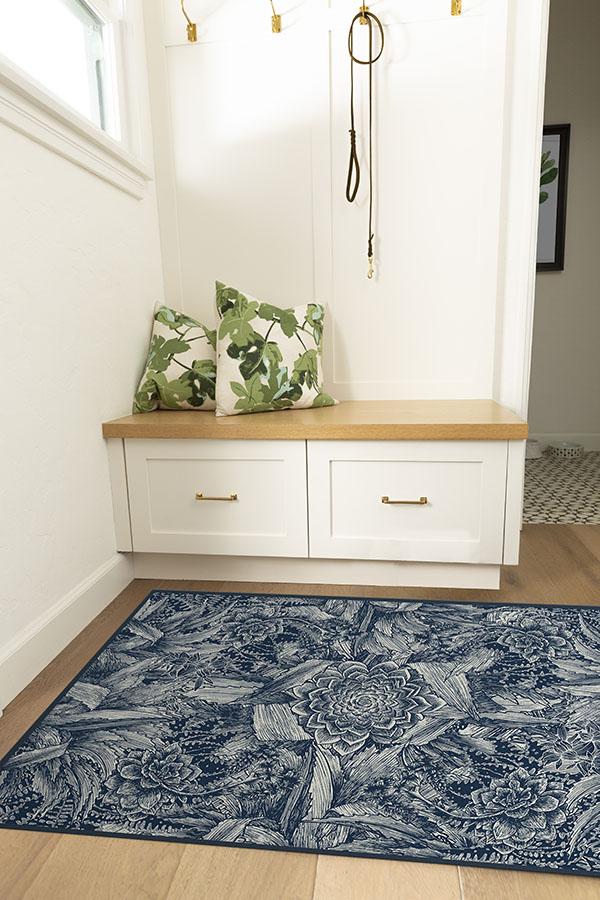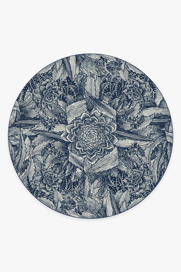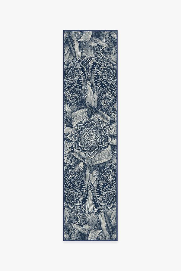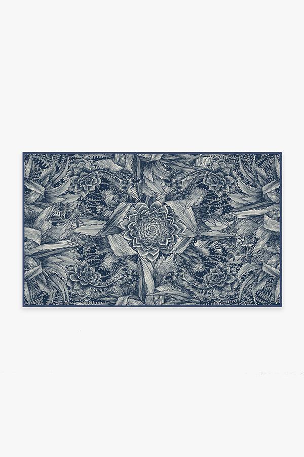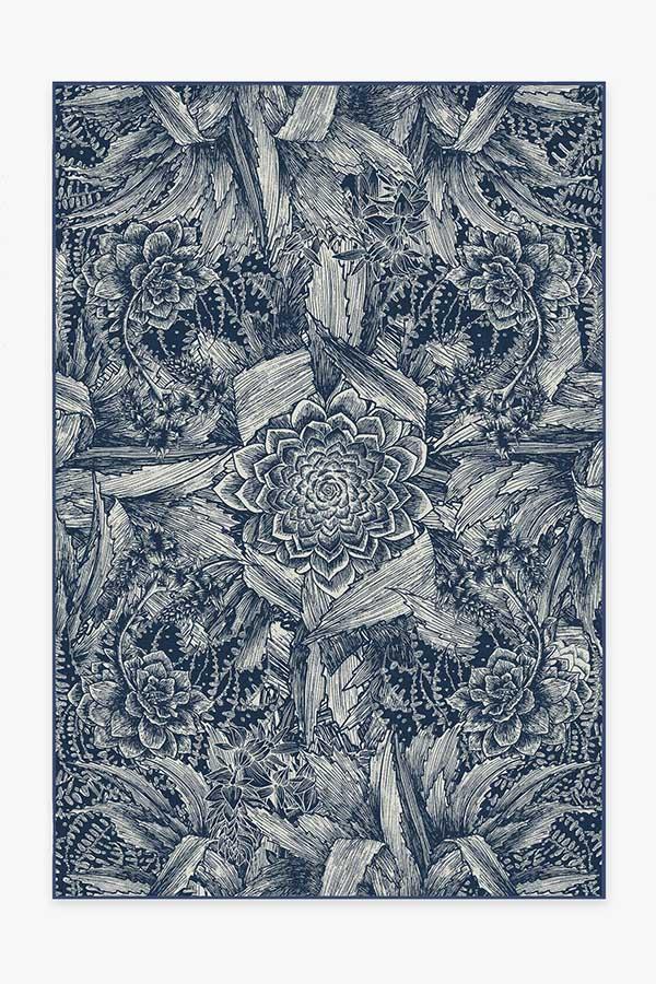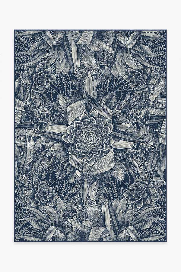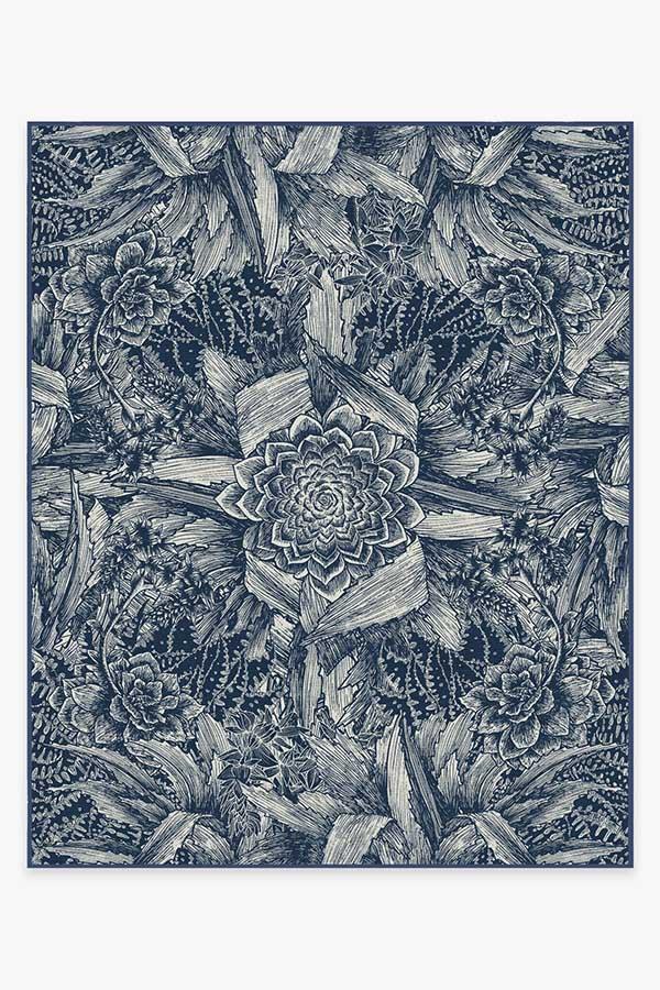 Floral rugs get a modern interpretation with our Echeveria Navy Rug. Instead of delicate petals, this rug features the famous rose-shaped succulent, echeveria, in a mysterious, monochromatic blue color, surrounded by a cornucopia of succulent and cactus leaves.