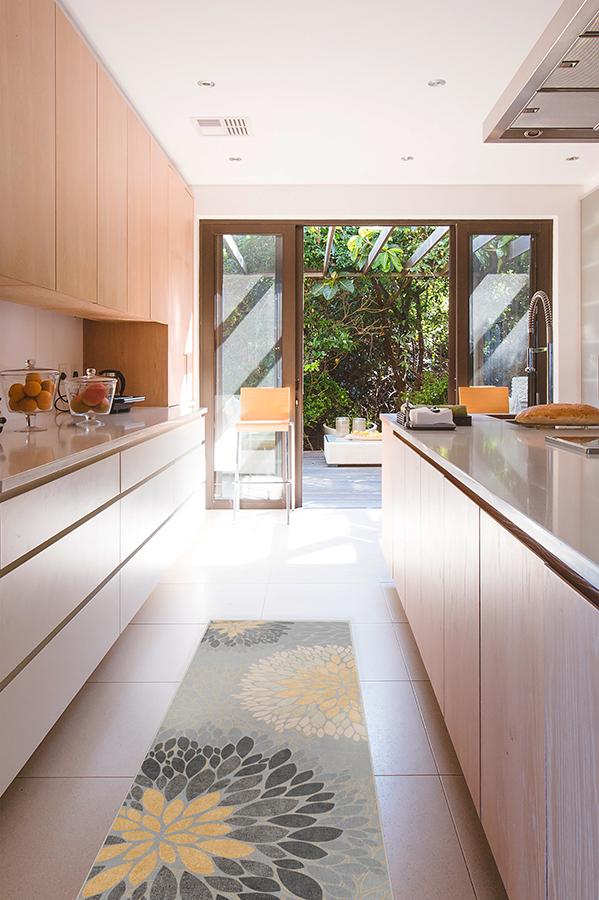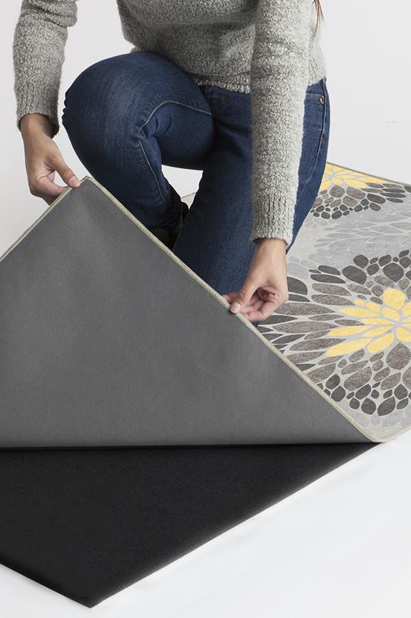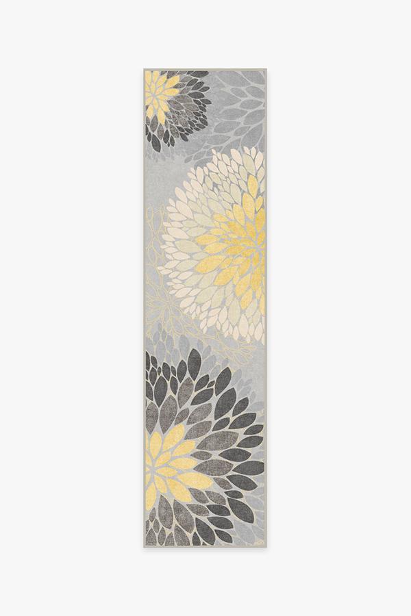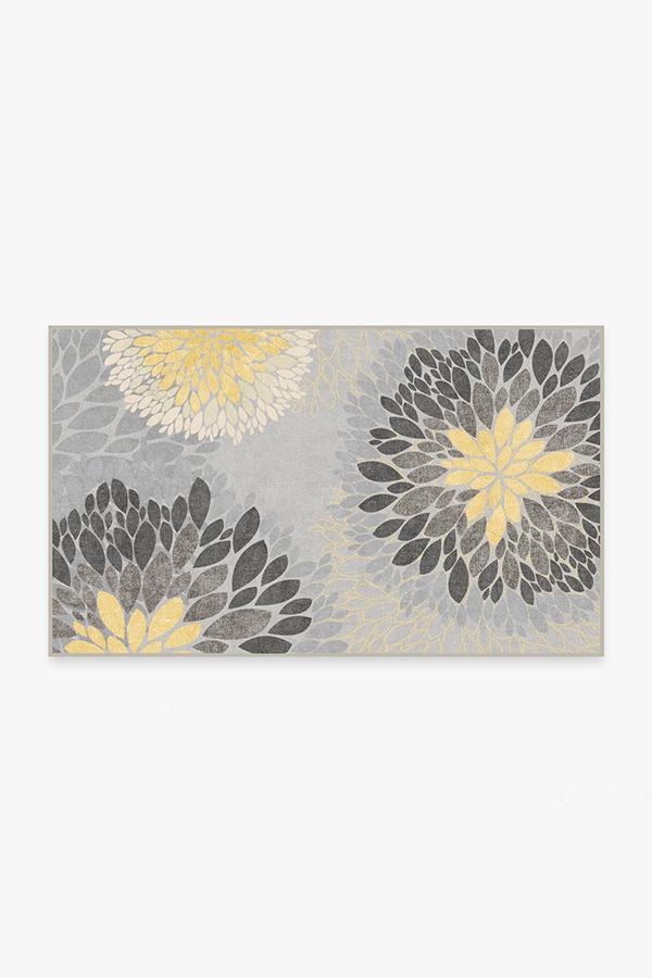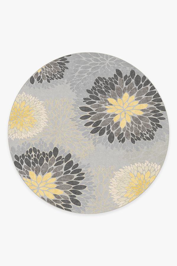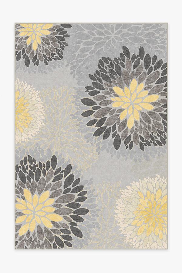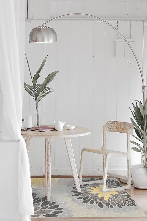 Warm and inviting, our Floral Medallion Yellow Grey Rug is just the accent piece to update a room. This contemporary floral rug motif is displayed in bright colors of polenta, dandelion yellow, and pewter and beautifully blended onto a backdrop of silver and dove grey.