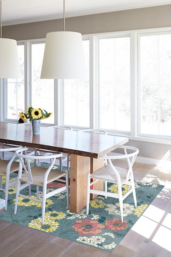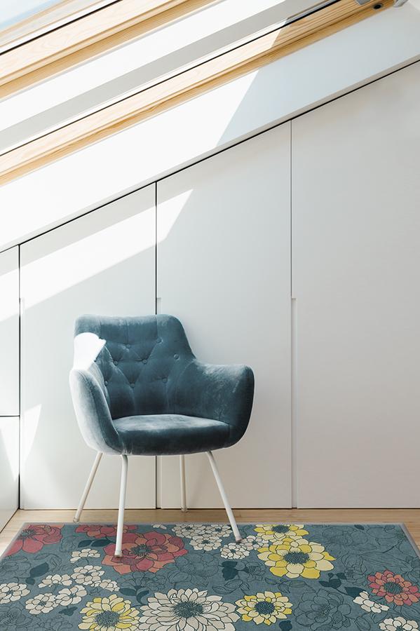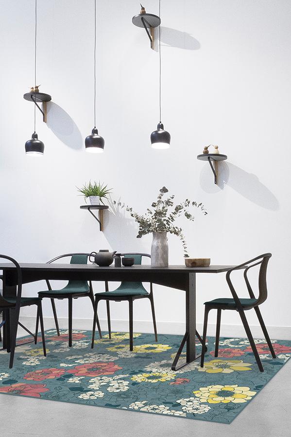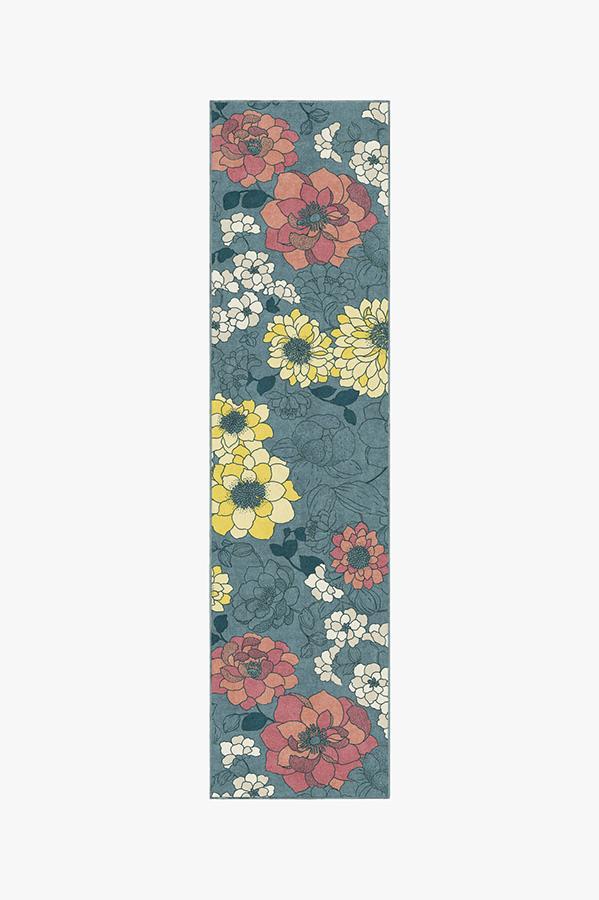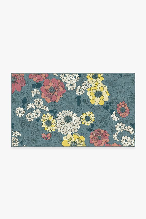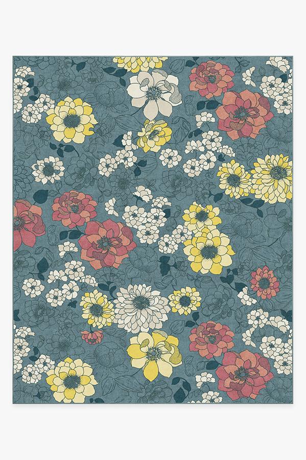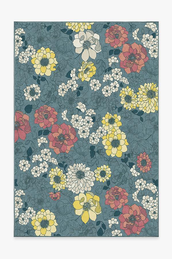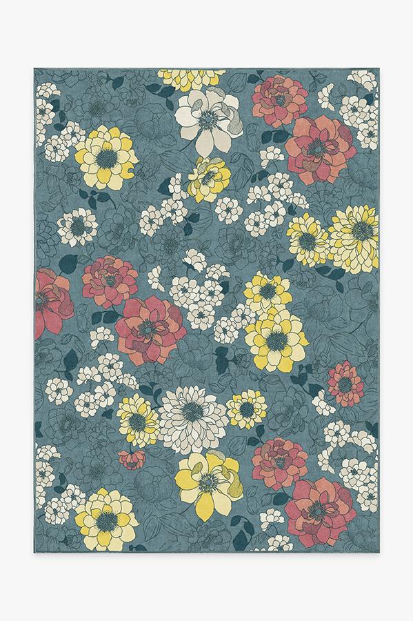 Our Floret Teal Blue rug uses intricate line work to create this enchanting floral motif in pinks and yellows on a blue background.