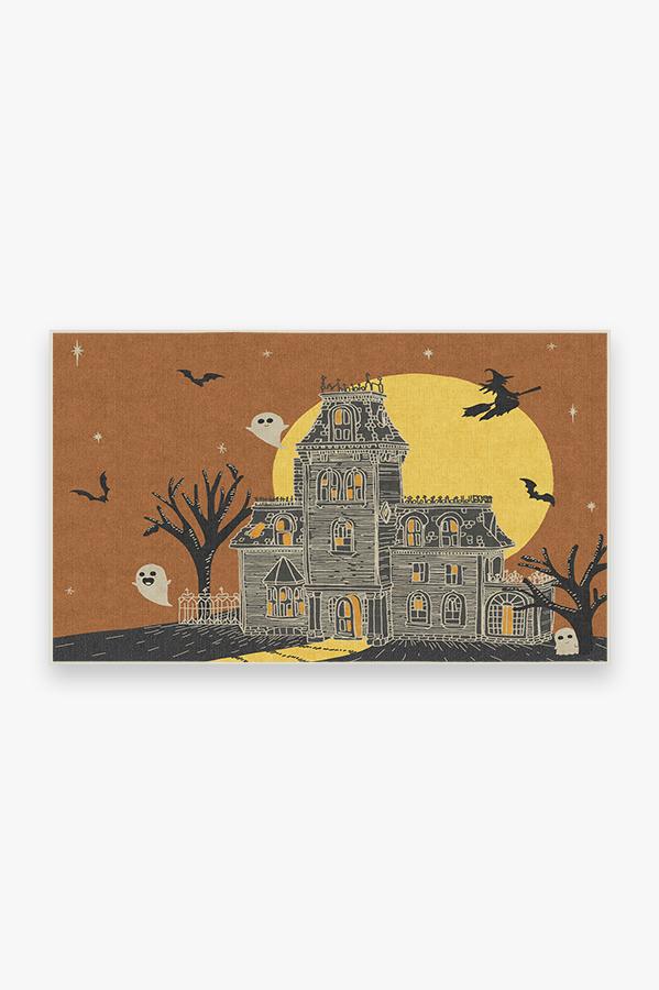 This Halloween season, give your guests a haunting hello with the Fright Night Rug. Set against a rust orange background and a big yellow full moon, this rug features a creepy haunted house at the center surrounded by a witch on a broomstick, ghosts, and bats. A fun take on this familiar theme, this rug will surely set a spooky tone to your Halloween party and decor.
