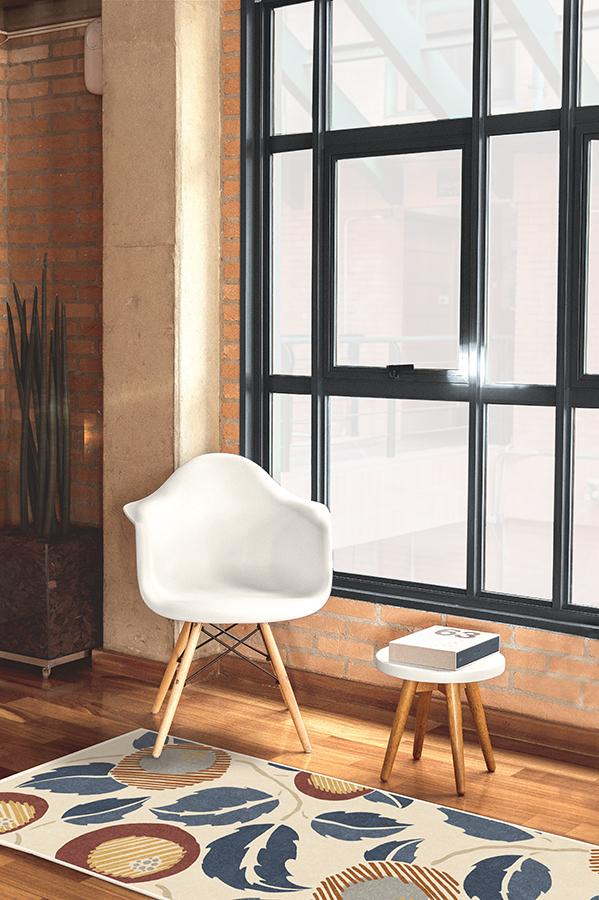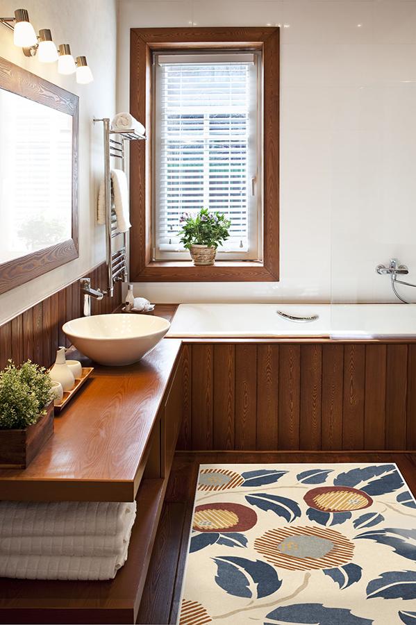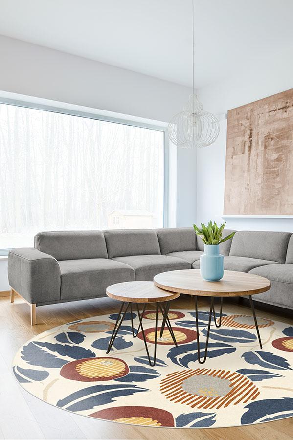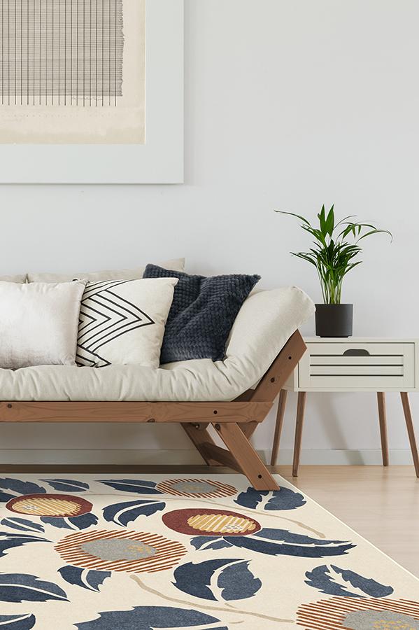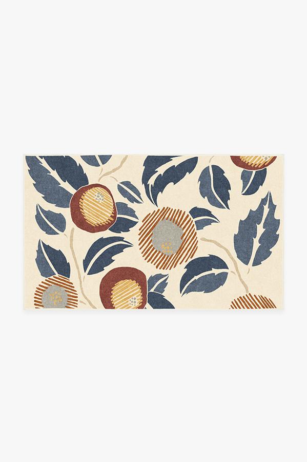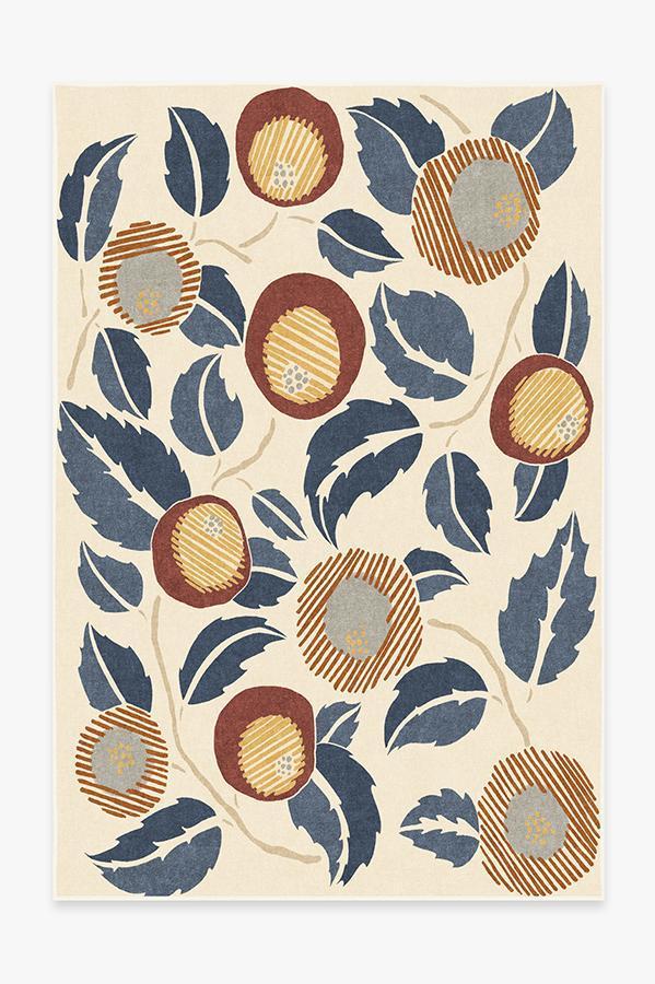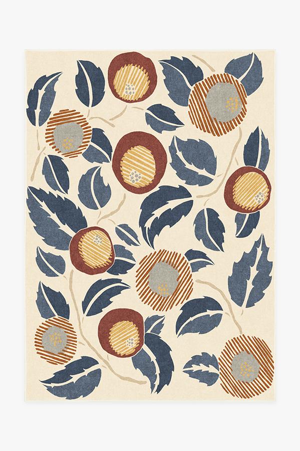 Inspired by Yumeji Takehisa, our Hana Imari rug features a modern-retro floral design colored in beautiful shades of blue and orange on a neutral cream background reminiscent of Imari porcelain.