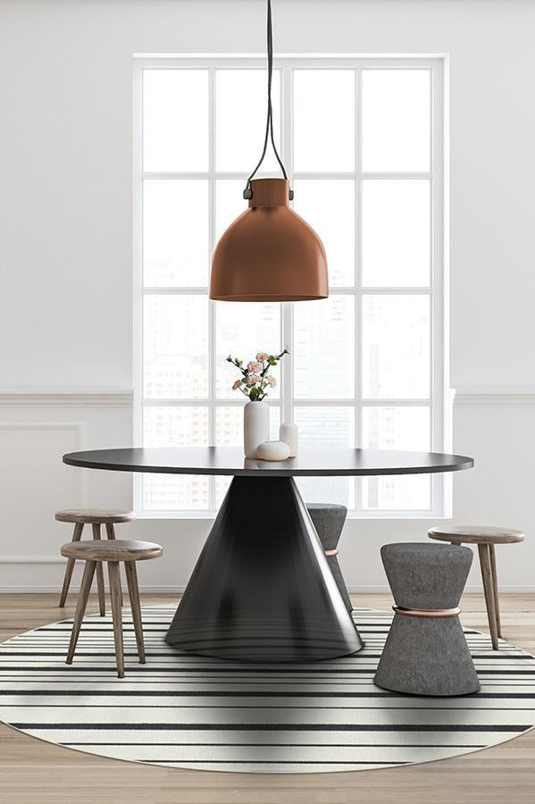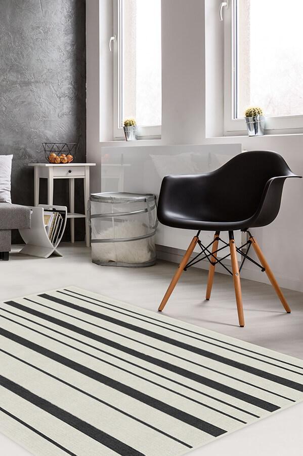 The classic motif of our Hudson Stripe Black rug takes a familiar but unexpected turn with bold and fine lines of charcoal grey on sand.