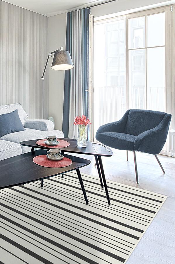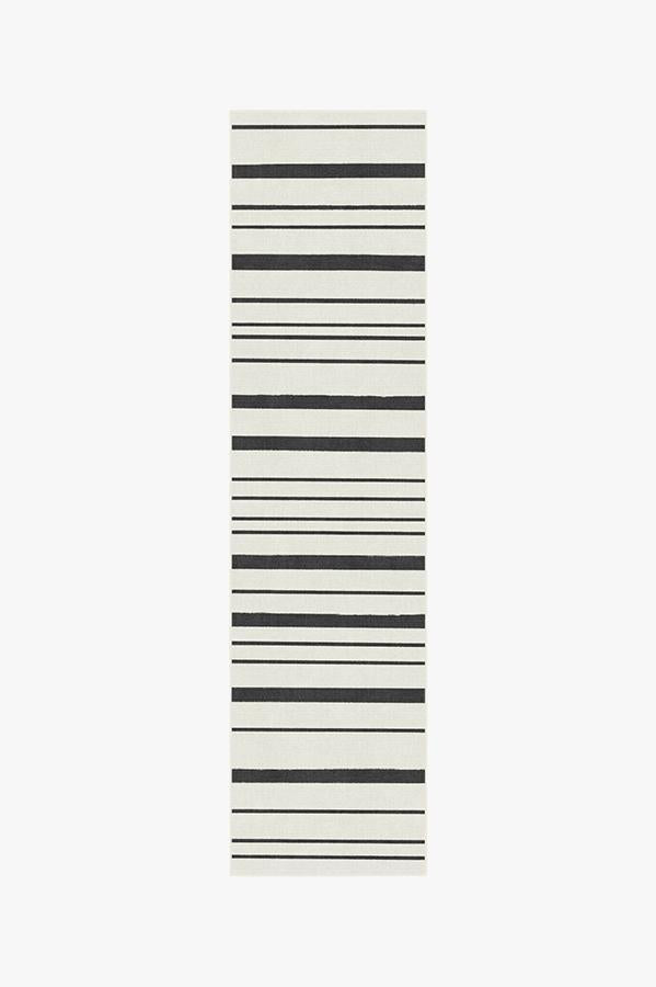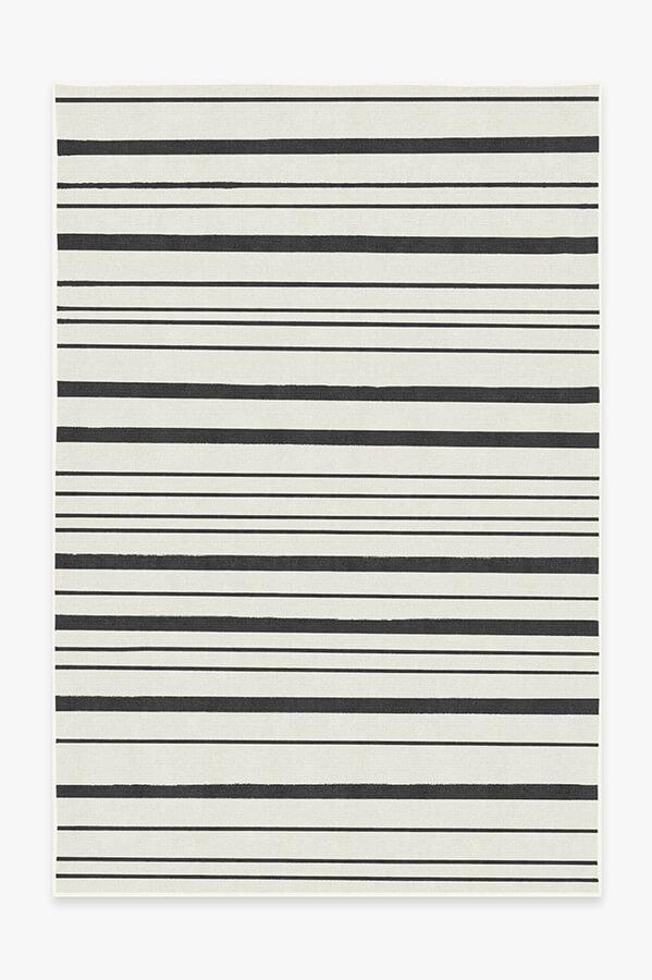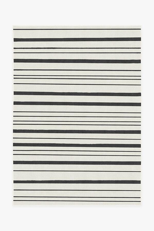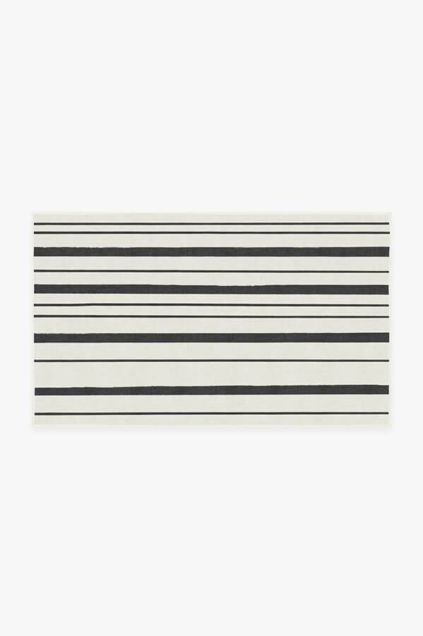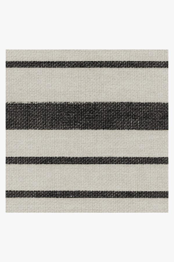 The classic motif of our Hudson Stripe Black rug takes a familiar but unexpected turn with bold and fine lines of charcoal grey on sand.