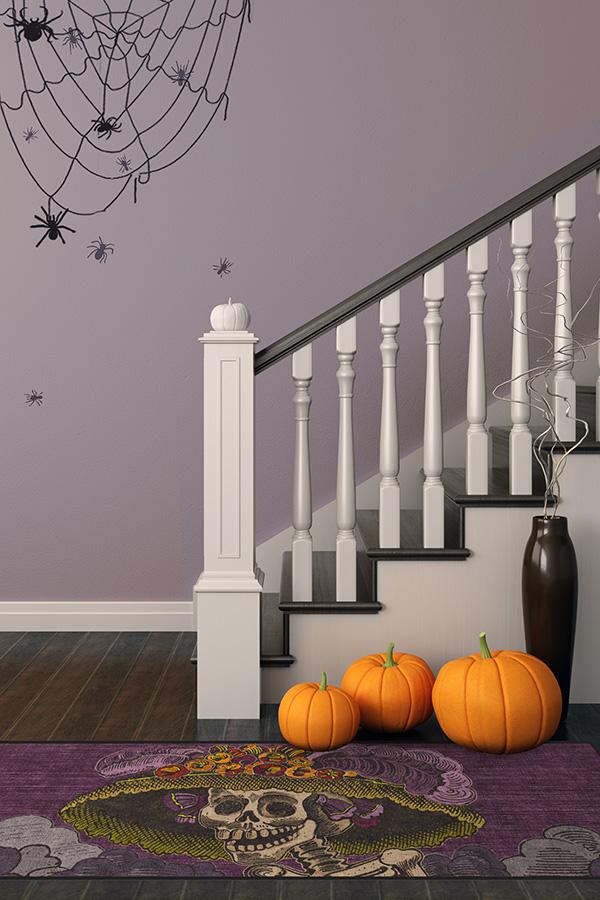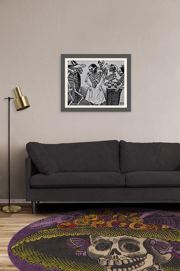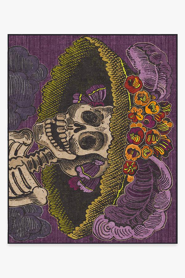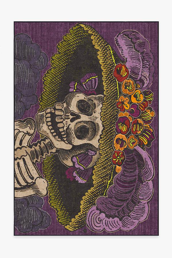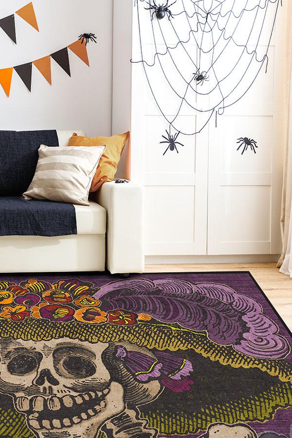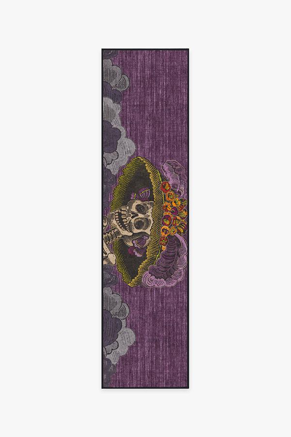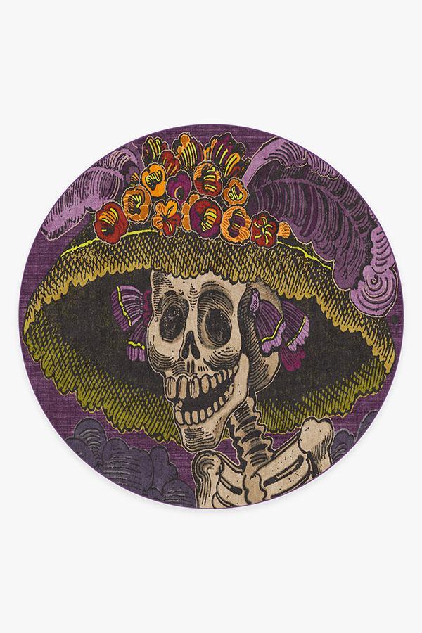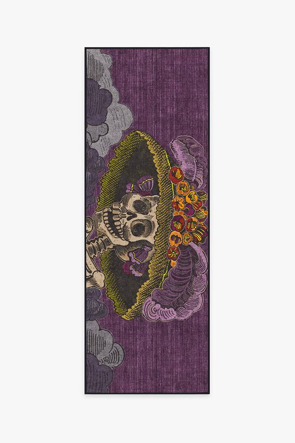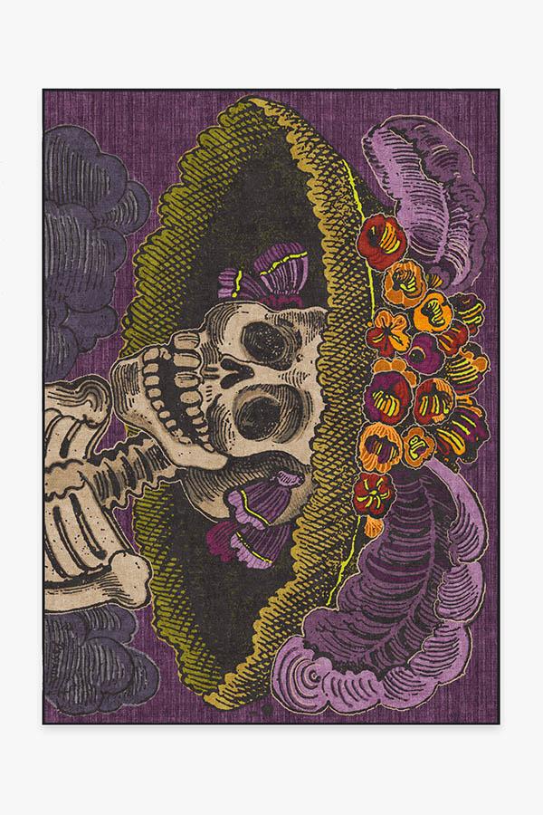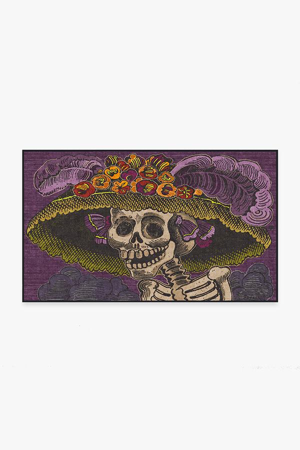 Celebrate the Mexican holiday, Dia de los Muertos, or Day of the Dead, by unrolling our Jose Posada Calavera Catrina rug. Inspired by the iconic etching, La Calavera Catrina, created circa 1910-1913 by famous printmaker, cartoon illustrator and lithographer José Guadalupe Posada, this illustrated motif depicts an elegant skeleton wearing a fancy, feather and flower-filled hat colored in lavish hues of eggplant, autumn orange, marigold and lavender. For a festive addition, roll out this macabre and humorous, decorative accent.