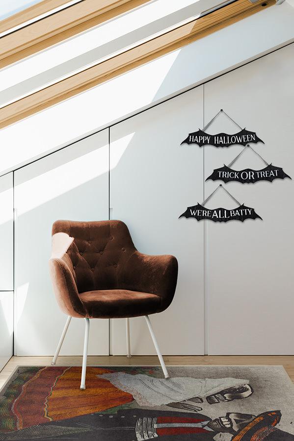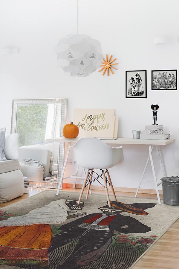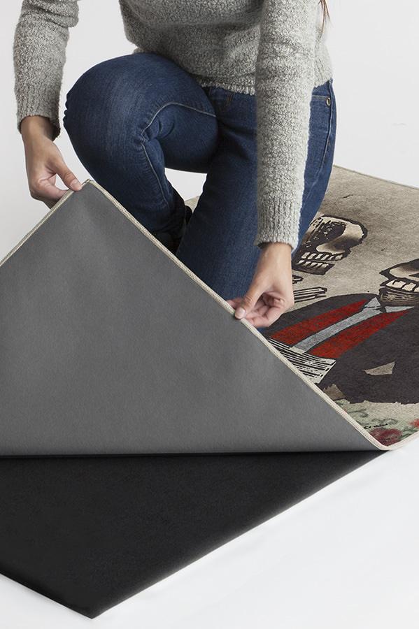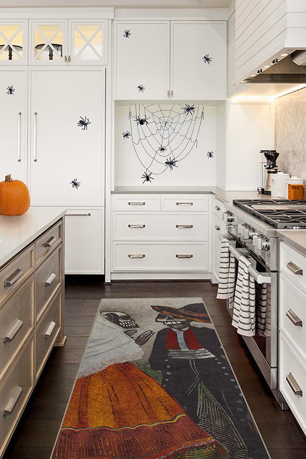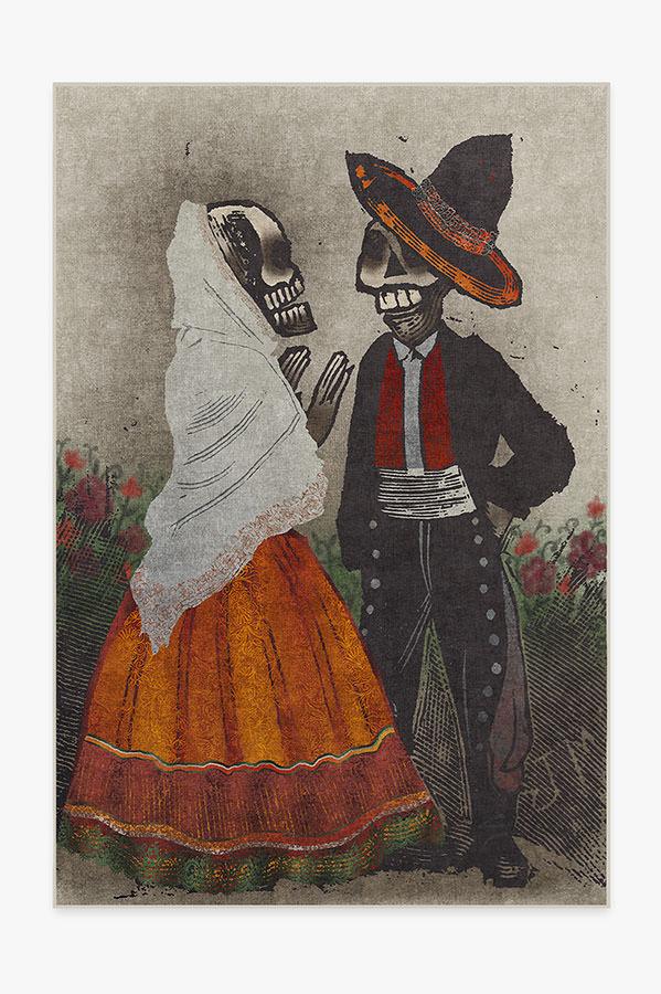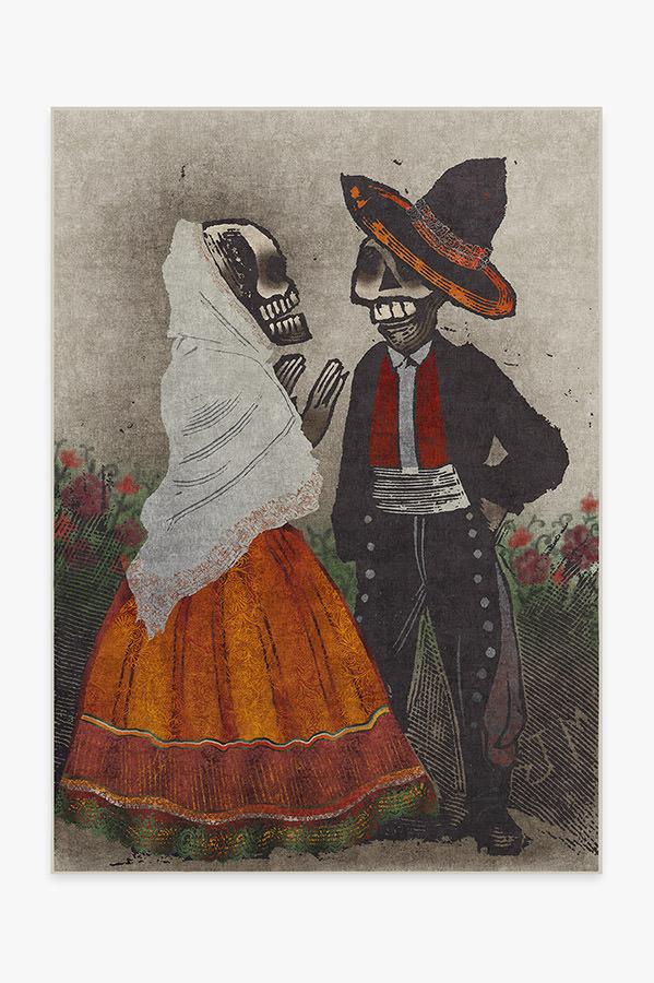 Unroll our Jose Posada Feast of the Dead rug to add Dia de los Muertos pizzaz to your Halloween decorations. Originally hand-engraved by the famous Mexican political cartoonist and lithographer JosŽ Guadalupe Posada (circa 1910), this whimsical and satirical graphic motif, displayed in haunting hues of autumn, sundance red, gunmetal and charcoal, features two skeletal figures of a man and woman talking during the feast of the dead. Perfectly suitable to display on the floor or on the wall as an impressive holiday accent.