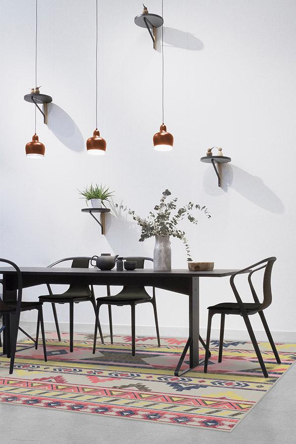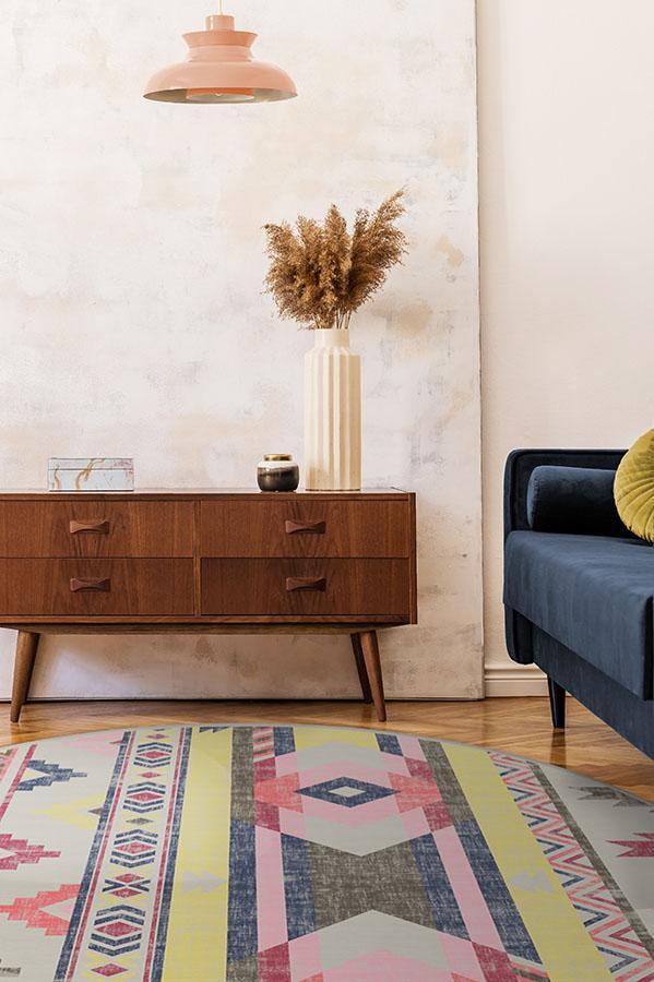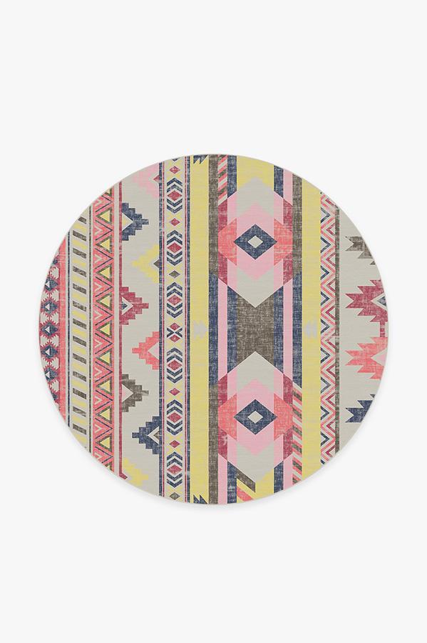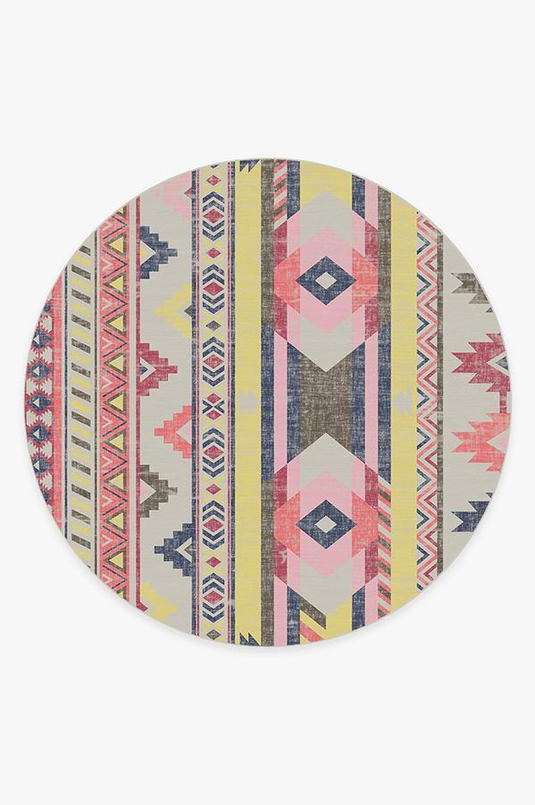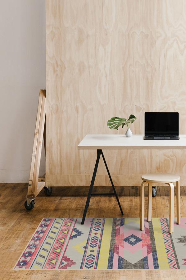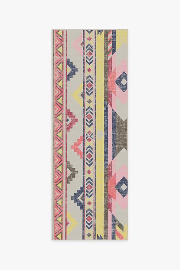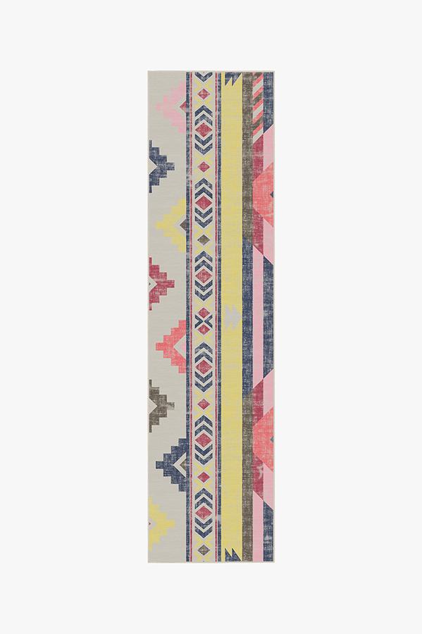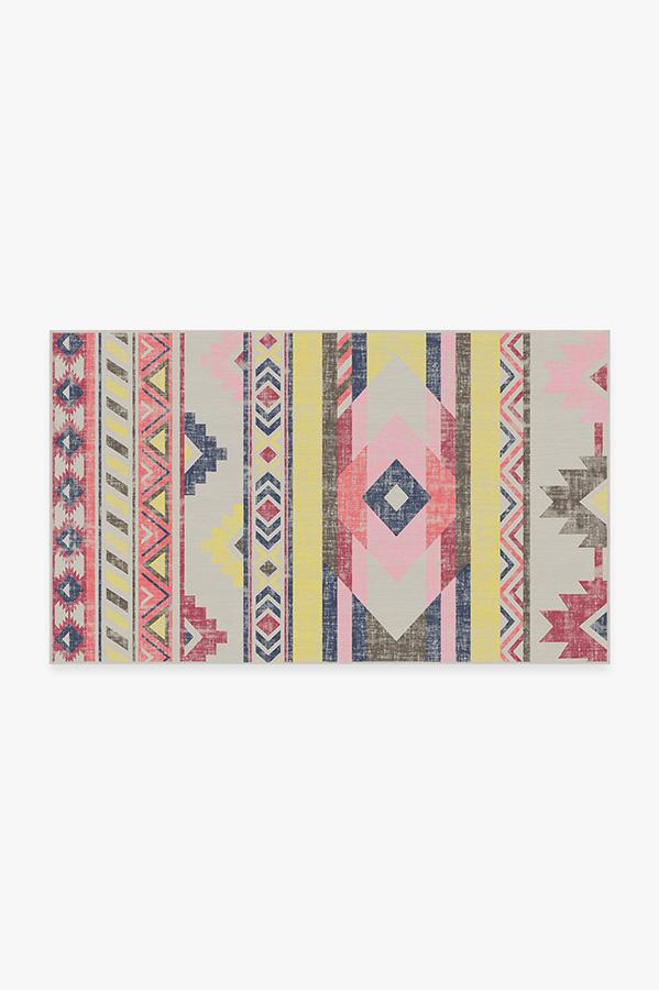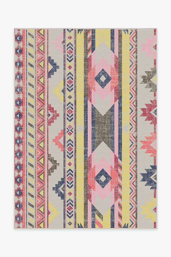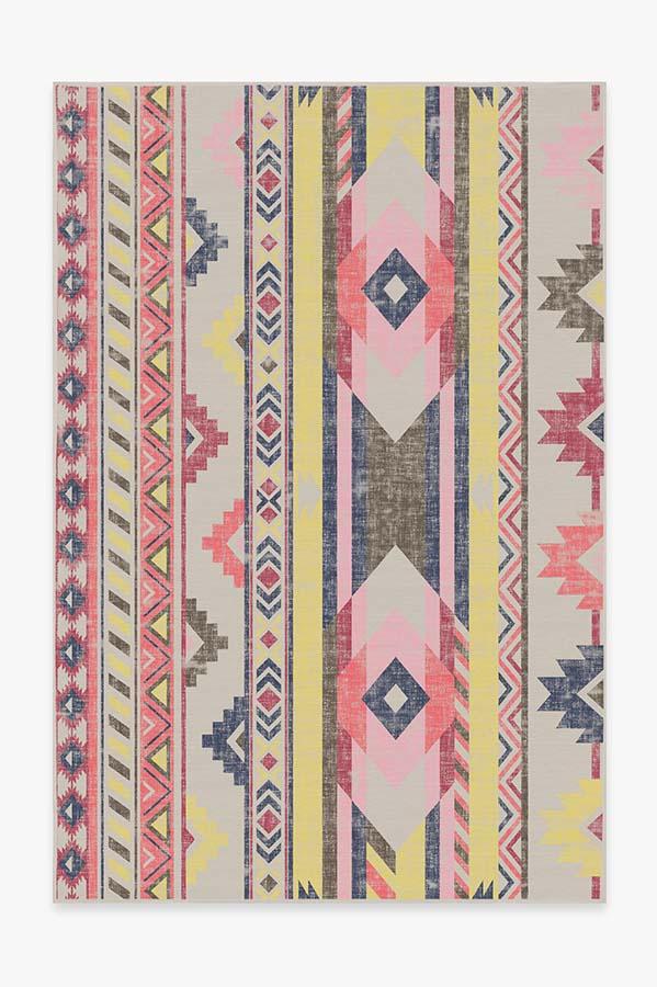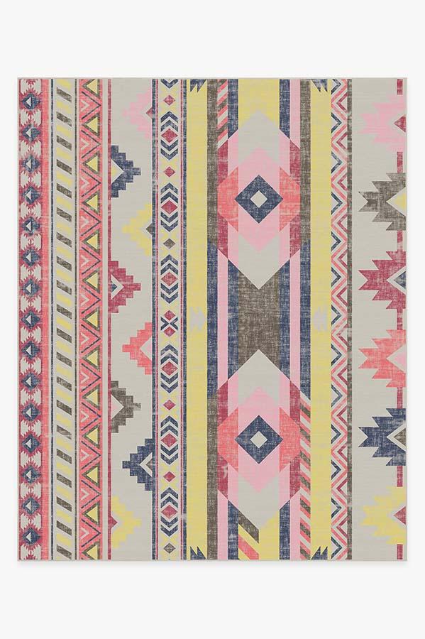 Our Kilim Batik Pink Rug enlivens any room with its vibrant color and geometric design inspired by Turkish kilim rugs. Rendered in cotton candy pink, complemented by hints of navy blue, silver taupe, dandelion yellow, ash grey, rouge, and watermelon, this colorful rug will add energy to any Scandinavian, modern, or bohemian-themed space.