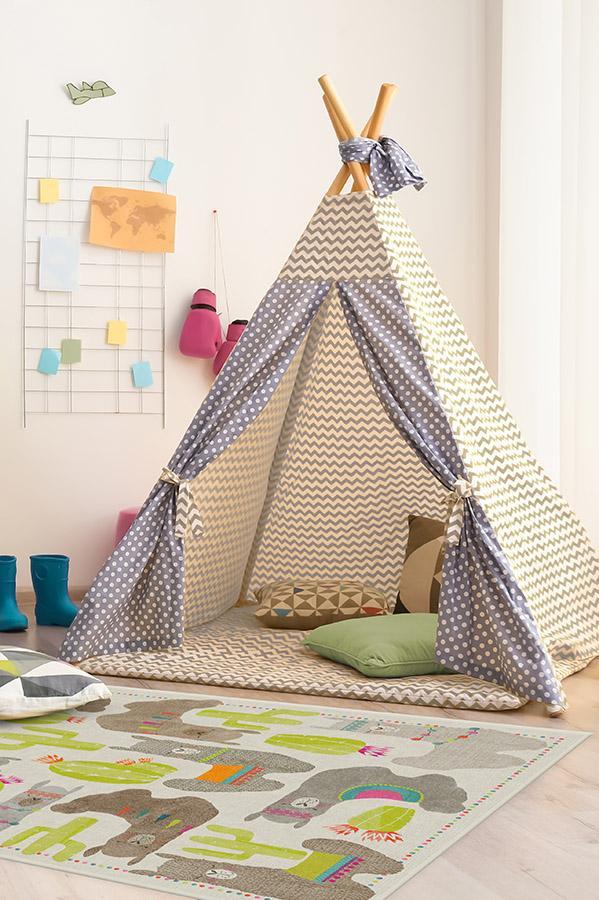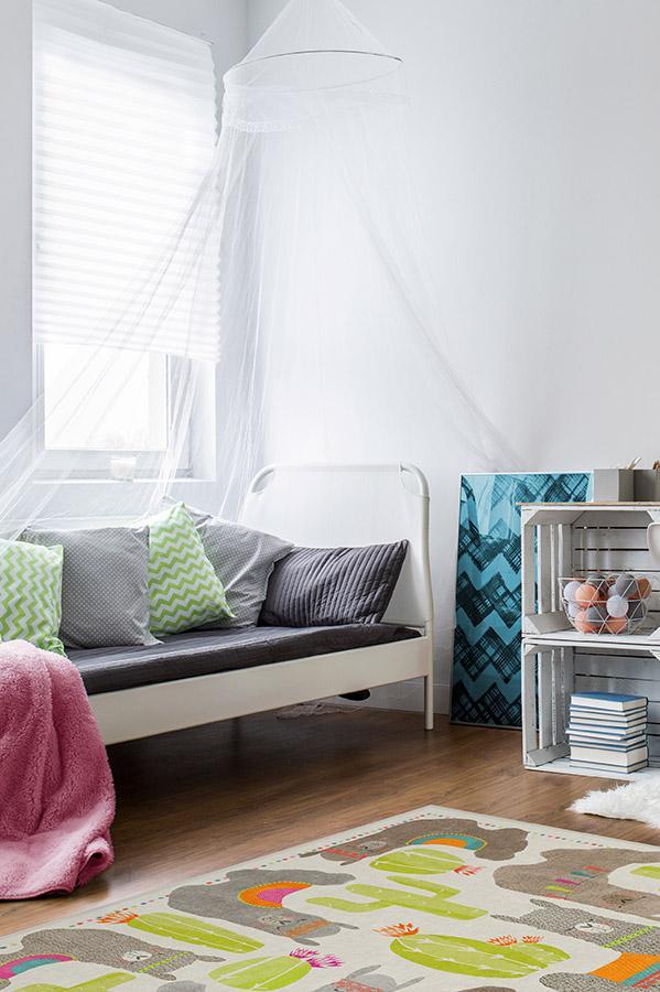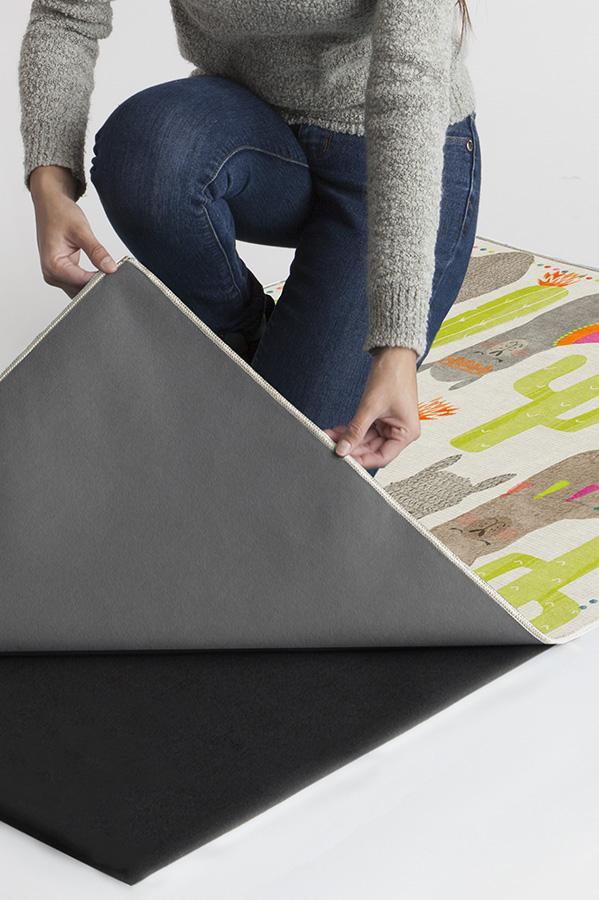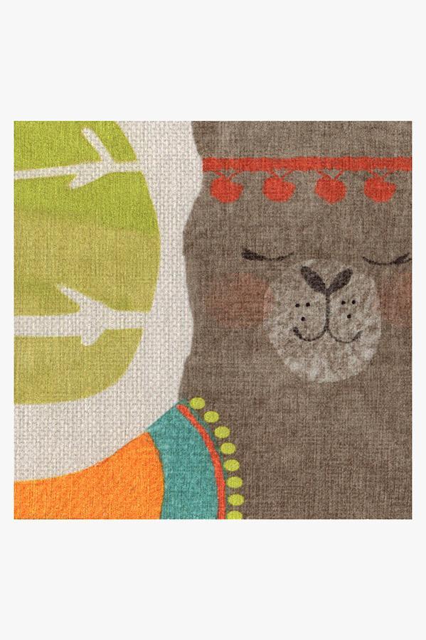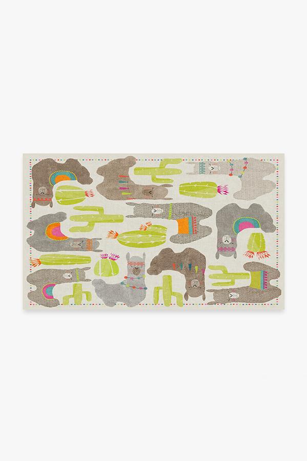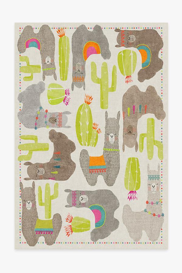 Adorned with sleepy, happy llamas draped in South American garlands and saddle blankets, our Llama Fun Natural Rug couldn't be sweeter. Wandering woolies and flowering cacti are accented in softly textured hues of mushroom, dove grey, and pops of neon chartreuse, lending a festive and celebratory design to any child's room.